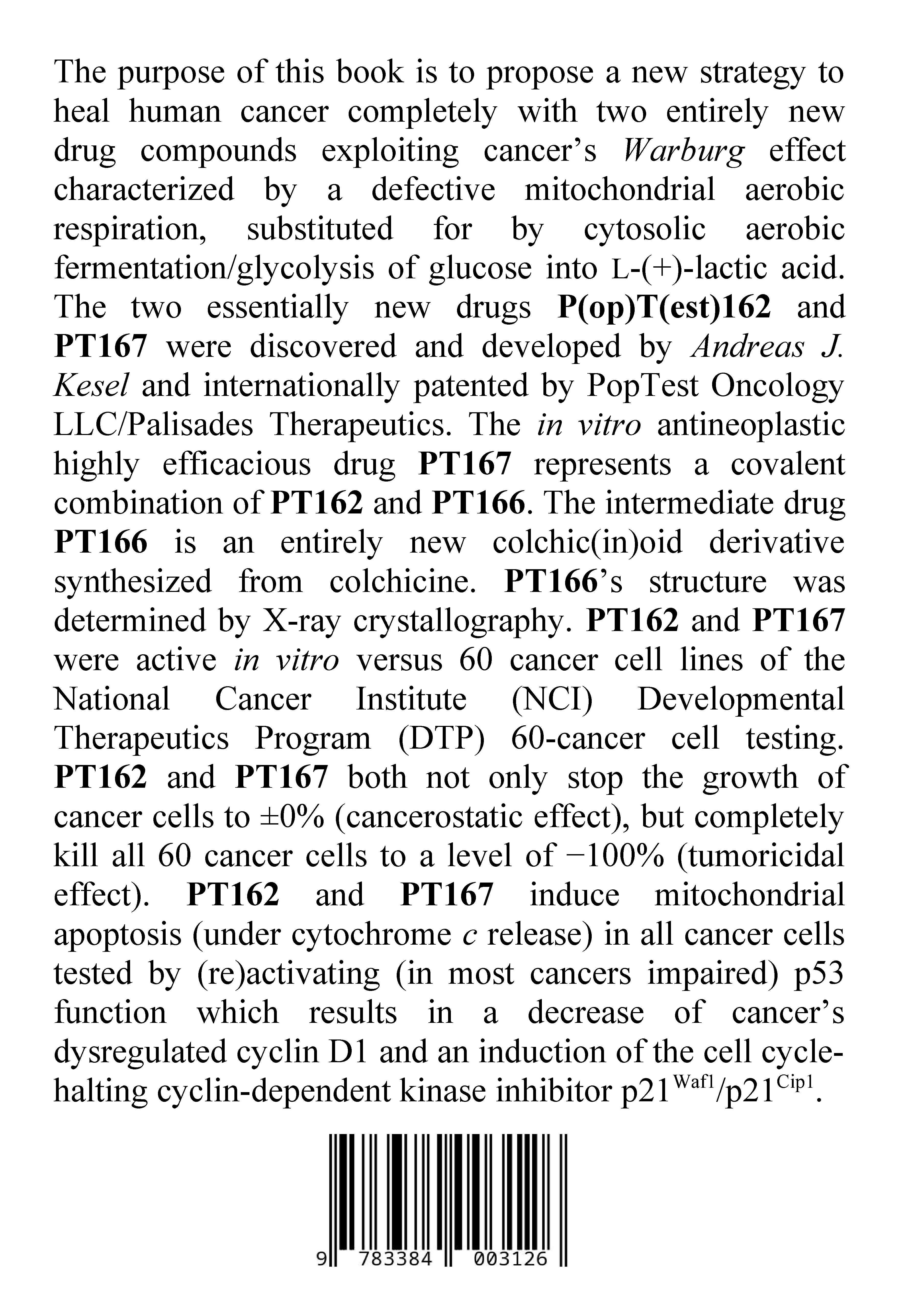 The purpose of this book is to propose a new strategy to heal human cancer completely with two entirely new drug compounds exploiting cancer's Warburg effect characterized by a defective mitochondrial aerobic respiration, substituted for by cytosolic aerobic fermentation/glycolysis of glucose into L-(+)-lactic acid. The two essentially new drugs P(op)T(est)162 and PT167 were discovered and developed by Andreas J. Kesel and internationally patented by PopTest Oncology LLC/Palisades Therapeutics. The in vitro antineoplastic highly efficacious drug PT167 represents a covalent combination of PT162 and PT166. The intermediate drug PT166 is an entirely new colchic(in)oid derivative synthesized from colchicine. PT166's structure was determined by X-ray crystallography. PT162 and PT167 were active in vitro versus 60 cancer cell lines of the National Cancer Institute (NCI) Developmental Therapeutics Program (DTP) 60-cancer cell testing. PT162 and PT167 both not only stop the growth of cancer cells to ±0% (cancerostatic effect), but completely kill all 60 cancer cells to a level of -100% (tumoricidal effect). PT162 and PT167 induce mitochondrial apoptosis (under cytochrome c release) in all cancer cells tested by (re)activating (in most cancers impaired) p53 function which results in a decrease of cancer's dysregulated cyclin D1 and an induction of the cell cycle-halting cyclin-dependent kinase inhibitor p21Waf1/p21Cip1.It was found that compound 1 (PT162, NSC 796018), a new compound never synthesized before [according to Chemical Abstracts Service (CAS®) SciFinder® search], induced apoptosis in all cell lines of the National Cancer Institute (NCI) Developmental Therapeutics Program (DTP) 60-cancer cell 5-dose testing, excluding leukemia cell lines, in the micromolar range of growth inhibition 50% (GI50). The author decided to merge compound 1 (PT162, NSC 796018) with the colchic(in)oid compound 2 (PT166, NSC 750423) which showed submicromolar GI50 in the NCI DTP 60-cancer cell 5-dose testing, but did not induce cancer cell apoptosis. Compound 2 (PT166, NSC 750423) was synthesized from colchicine and thiosemicarbazide in an one-step procedure and represents a new compound never synthesized before [according to Chemical Abstracts Service (CAS®) SciFinder® search] just as compound 1 (PT162, NSC 796018). Compound 1 (PT162, NSC 796018) reacted with compound 2 (PT166, NSC 750423) under impact of sodium hydroxide (NaOH) to give compound 3. Compound 3 (PT167, NSC 799315), a new compound never synthesized before [according to Chemical Abstracts Service (CAS®) SciFinder® search], showed submicromolar GI50 in the NCI DTP 60-cancer cell 5-dose testing constantly in most cell lines including leukemia cells. Importantly, compound 3 (PT167, NSC 799315) was able to induce apoptosis in all investigated cancer cells, including leukemia cell lines, with a Mean of Inhibition Data (MID) for total growth inhibition (TGI, growth inhibition 100%) of 4.57 µM, and a MID for lethal concentration 50% (LC50) of 15.85 µM. The author reports here the chemistry and NCI DTP 60-cancer cell 5-dose testing data for compound 1 (PT162, NSC 796018), compound 2 (PT166, NSC 750423) and compound 3 (PT167, NSC 799315), and demonstrates the apoptotic release of cytochrome c into the cytosol and activation of effector caspases induced by compounds 1 and 3. The author proposes that compound 1 and compound 3 induce apoptosis according to the Warburg hypothesis of pre-damaged respiration as a hallmark of cancer by exploiting the defect in mitochondrial cardiolipin-cytochrome c association in cancer cells.