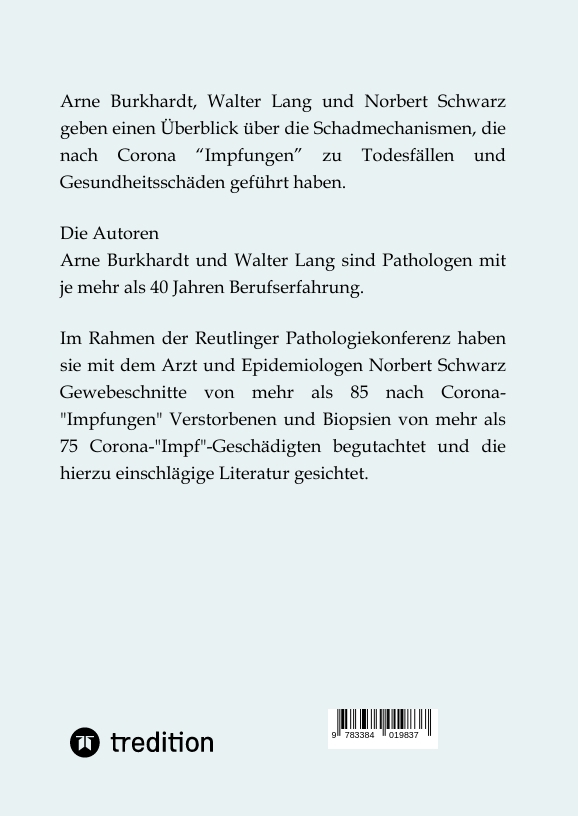 Die Autoren Arne Burkhardt und Walter Lang sind Pathologen mit je mehr als 40 Jahren Berufserfahrung. Im Rahmen der Reutlinger Pathologiekonferenz haben sie mit dem Arzt und Epidemiologen Norbert Schwarz Gewebeschnitte von mehr als 85 nach Corona-"Impfungen" Verstorbenen und Biopsien von mehr als 75 Corona-"Impf"-Geschädigten begutachtet und die hierzu einschlägige Literatur gesichtet.