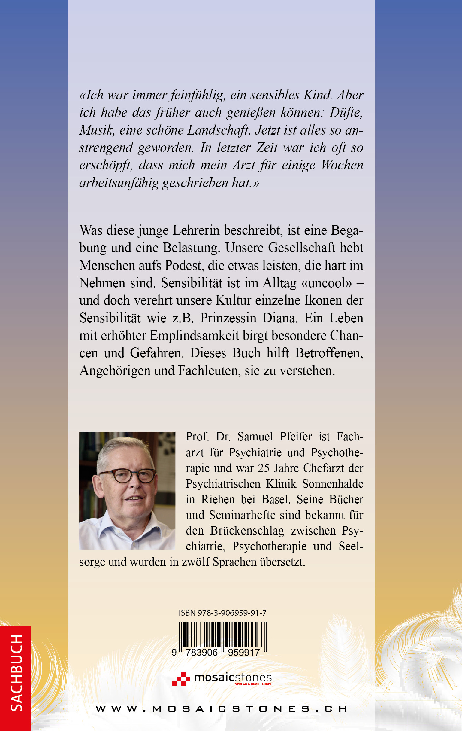 Was diese junge Lehrerin beschreibt, ist eine Begabung und eine Belastung. Unsere Gesellschaft hebt Menschen aufs Podest, die etwas leisten, die hart im Nehmen sind. Sensibilität ist im Alltag «uncool» – und doch verehrt unsere Kultur einzelne Ikonen der Sensibilität wie z.B. Prinzessin Diana. Ein Leben mit erhöhter Empfindsamkeit birgt besondere Chancen und Gefahren. Dieses Buch hilft Betroffenen, Angehörigen und Fachleuten, sie zu verstehen.