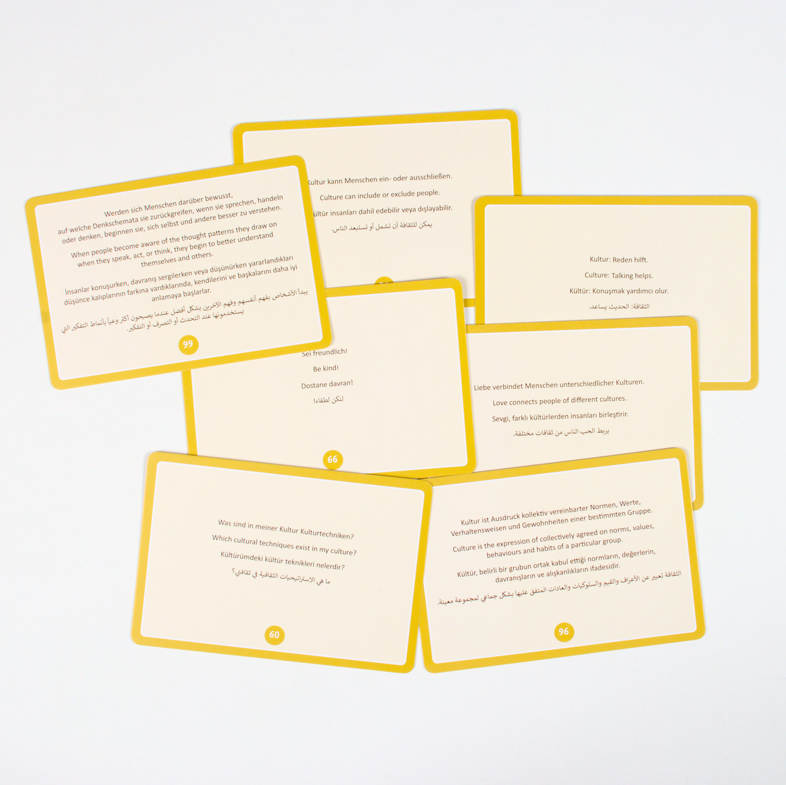 In einer globalisierten Welt wird das Thema »Kultur« immer wichtiger, weil Menschen unterschiedlichster Kulturen zusammenkommen und -arbeiten. Das Kartenset regt dazu an, die eigenen Werte, Gefühle und Gedankenwelten zu erkunden und darüber mit Menschen anderer Kulturen ins Gespräch zu kommen.