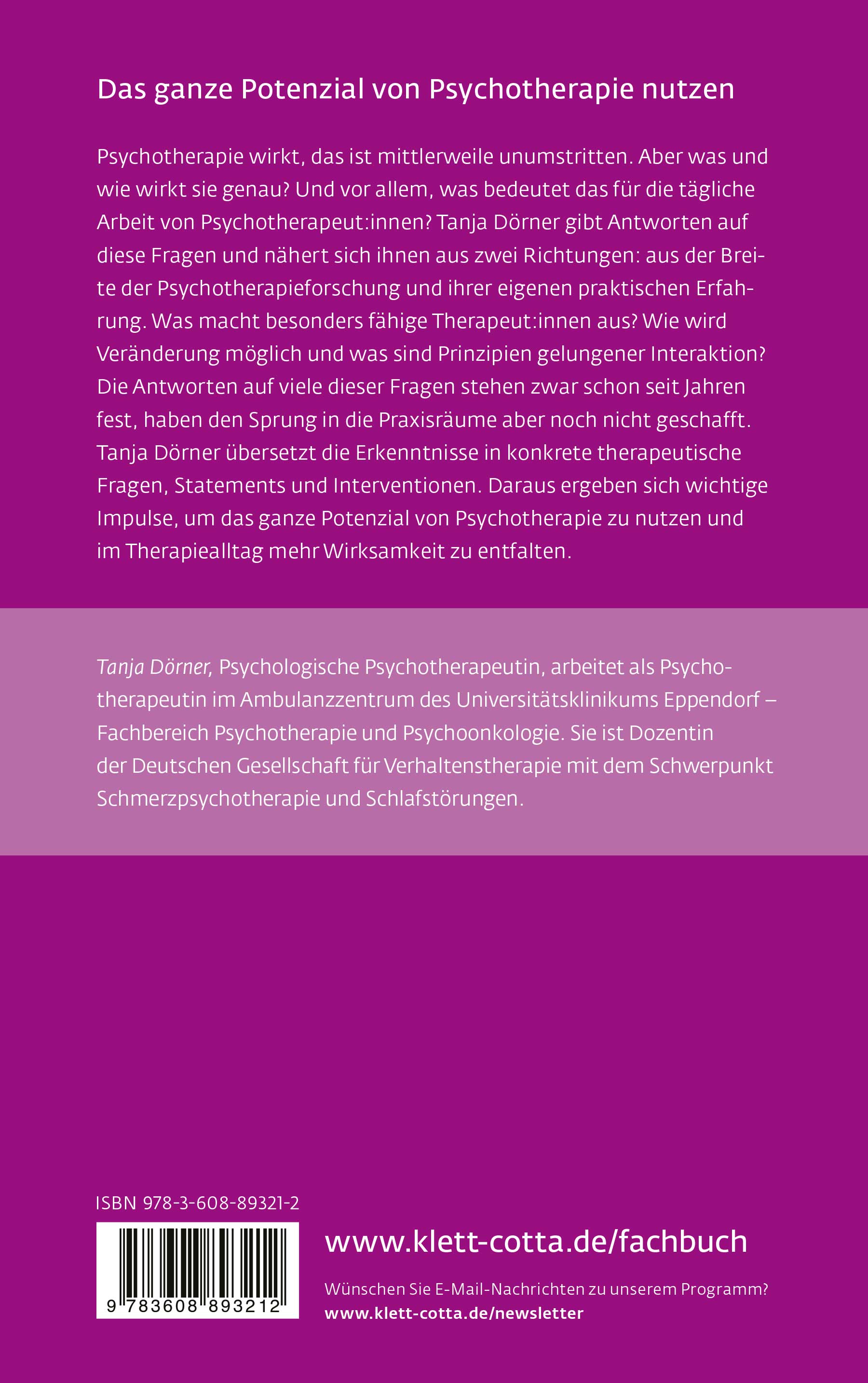 Psychotherapie wirkt, das ist mittlerweile unumstritten. Aber was und wie wirkt sie genau? Und vor allem, was bedeutet das für die tägliche Arbeit von Psychotherapeut:innen? Auf diese Fragen gibt das vorliegende Buch Antworten und nähert sich ihnen aus zwei Richtungen: Aus der Breite der Psychotherapieforschung und der praktischen Erfahrung der Autorin. Was macht besonders fähige Therapeut:innen aus? Wie wird Veränderung möglich und was sind Prinzipien gelungener Interaktion? Die Antworten auf viele dieser Fragen stehen zwar schon seit Jahren fest, haben den Sprung in die Praxisräume aber noch nicht geschafft. Dieses Buch übersetzt die Erkenntnisse in konkrete therapeutische Fragen, Statements und Interventionen. Daraus ergeben sich wichtige Impulse, um das ganze Potenzial von Psychotherapie zu nutzen und im Therapiealltag mehr Wirksamkeit zu entfalten.