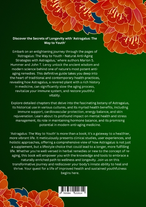 Discover the Secrets of Longevity with 'Astragalus: The Way to Youth'Embark on an enlightening journey through the pages of 'Astragalus: The Way to Youth - Natural Anti-Aging Strategies with Astragalus,' where authors Marion S. Hummer and John T. Leroy unlock the ancient wisdom and modern science behind one of nature's most potent anti-aging remedies. This definitive guide takes you deep into the heart of traditional and contemporary health practices, revealing how Astragalus, a revered plant with a rich history in medicine, can significantly slow the aging process, revitalize your immune system, and restore youthful vitality.Explore detailed chapters that delve into the fascinating botany of Astragalus, its historical use in various cultures, and its myriad health benefits, including immune support, cardiovascular protection, energy balance, and skin rejuvenation. Learn about its profound impact on mental health and stress management, its role in maintaining hormone balance, and its promising potential in modern anti-aging medicine.'Astragalus: The Way to Youth' is more than a book; it's a gateway to a healthier, more vibrant life. It meticulously presents clinical studies, user experiences, and holistic approaches, offering a comprehensive view of how Astragalus is not just a supplement, but a lifestyle choice that could lead to a longer, more fulfilling life. Whether you're well-versed in herbal remedies or new to the concept of re-aging, this book will empower you with the knowledge and tools to embrace a naturally enriched path to wellness and longevity. Join us on this transformative journey and rediscover your body's innate ability to heal and thrive. Your quest for a life of improved health and sustained youthfulness begins here.
