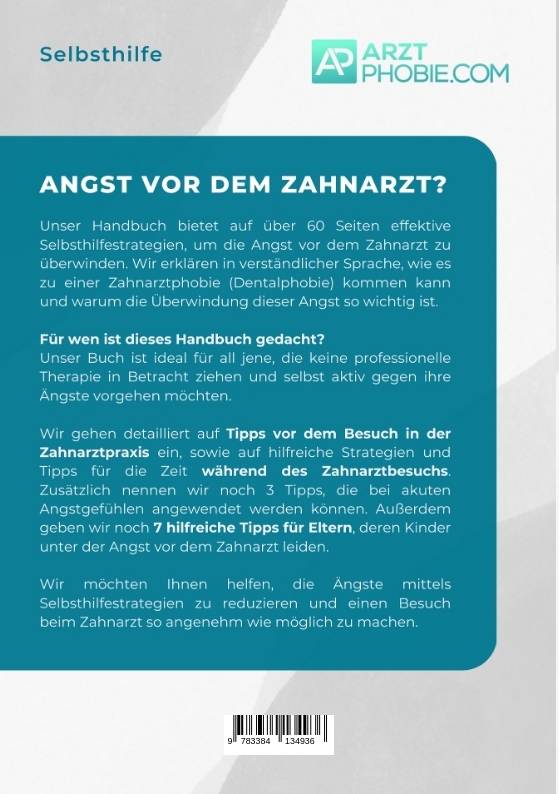 Im Selbsthilfe-Handbuch gegen die Zahnarztphobie von Arztphobie.com, möchten wir dir auf 60 Seiten helfen, die Angst vor dem Zahnarzt zu überwinden. Wir verzichten darauf, dich mit über 500 Seiten voller Fachchinesisch zu langweilen, und bieten dir stattdessen in einfacher Sprache schnelle und effektive Tipps und Strategien für die Zeit vor und während des Zahnarztbesuchs. Denn die Angst betrifft sowohl die Vorbereitung auf den Termin als auch das Erlebnis selbst.Außerdem bieten wir Eltern hilfreiche Tipps, falls ihr Kind unter Zahnarztangst leidet und dadurch der Praxisbesuch erschwert wird. Unsere Selbsthilfetipps ersetzen keine professionelle Therapie, können aber bei der Überwindung hilfreich sein. Sie geben dir die nötigen Ratschläge, um die Angst zu reduzieren. Du kannst sie einfach umsetzen und dein nächster Besuch beim Zahnarzt wird dadurch hoffentlich um einiges erträglicher!