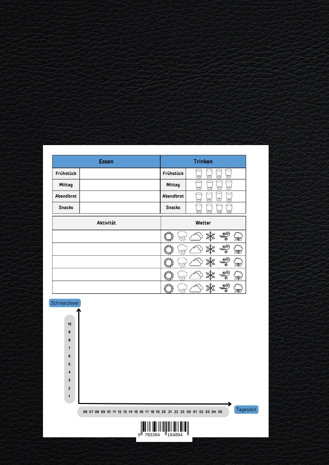 Entdecken Sie Ihren Weg zur besseren Schmerzbewältigung mit "Mein Schmerzwegbegleiter", Ihrem treuen Gefährten im täglichen Kampf gegen chronische Schmerzen. Speziell entworfen für Menschen, die mit langanhaltenden Schmerzen leben, bietet dieses umfassende Schmerztagebuch eine strukturierte Möglichkeit, jeden Aspekt Ihres Wohlbefindens zu verfolgen und zu analysieren.Eigenschaften:Persönliche Tagesübersichten: Beginnen Sie jeden Tag mit der Dokumentation von Datum, Laune, Schlafqualität, Schmerzlevel und Lokalisation sowie der Benennung Ihrer Schmerzen und anderer Symptome.Medikamentenprotokoll: Halten Sie akribisch die Einnahme Ihrer Medikamente fest, inklusive Uhrzeit, Dosierung und eventueller Nebenwirkungen, um Ihre Therapie optimal zu unterstützen.Ernährungs- und Aktivitätenjournal: Verfolgen Sie Ihre Ernährungsgewohnheiten und Aktivitäten, um Zusammenhänge zwischen Lebensstil und Schmerzempfinden zu erkennen.Wetterfühligkeit: Notieren Sie die Wetterbedingungen und beobachten Sie, wie diese Ihre Schmerzen beeinflussen können.Schmerzintensitätsdiagramm: Ein einzigartiges Säulendiagramm ermöglicht es Ihnen, Schmerzschwankungen über den Tag hinweg visuell festzuhalten und Muster zu erkennen.Im Format 17 x 24 cm gestaltet, bietet "Mein Schmerzwegbegleiter" ausreichend Platz für tägliche Eintragungen und ist damit ein idealer Begleiter für zu Hause oder unterwegs. Nutzen Sie dieses Tagebuch als Werkzeug, um Ihren Arztbesuch vorzubereiten, Therapieerfolge sichtbar zu machen und Ihren Weg zu einem besseren Umgang mit chronischen Schmerzen zu finden. Machen Sie den ersten Schritt zu einem aktiveren und selbstbestimmteren Leben mit Schmerzen.