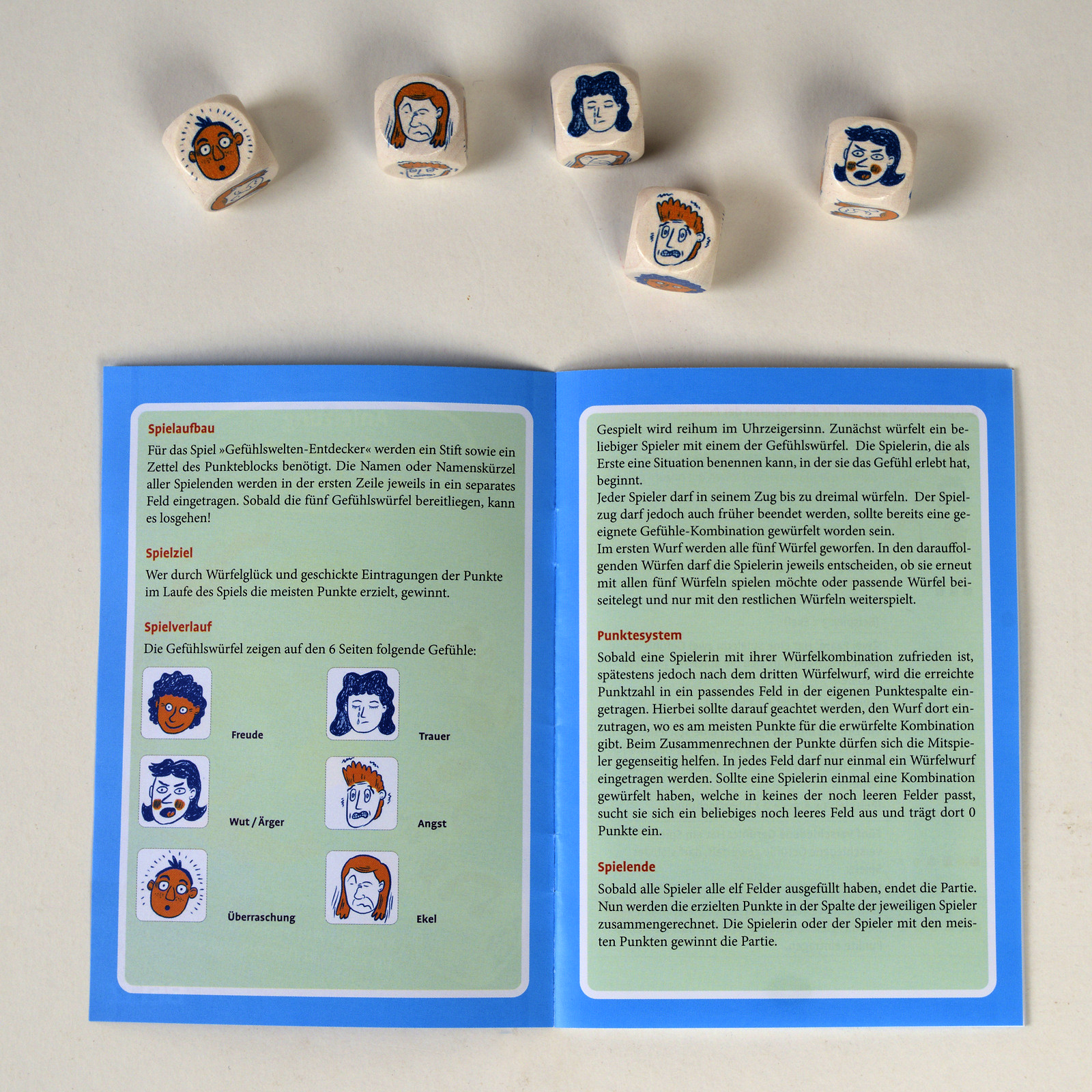 Freude, Überraschung, Traurigkeit, Angst, Wut und Ekel – diese Grundemotionen zeigen die Seiten der fünf Würfel im Gefühlswelten-Entdecker-Spiel. Über das Würfeln und viele weitere kreative Spielimpulse gehen Kinder auf Erkundung ihrer Gefühlswelt. Der spielerische Einstieg erleichtert das Gespräch darüber, woran man Gefühle erkennt, was sie auslöst und wie man mit ihnen umgeht.