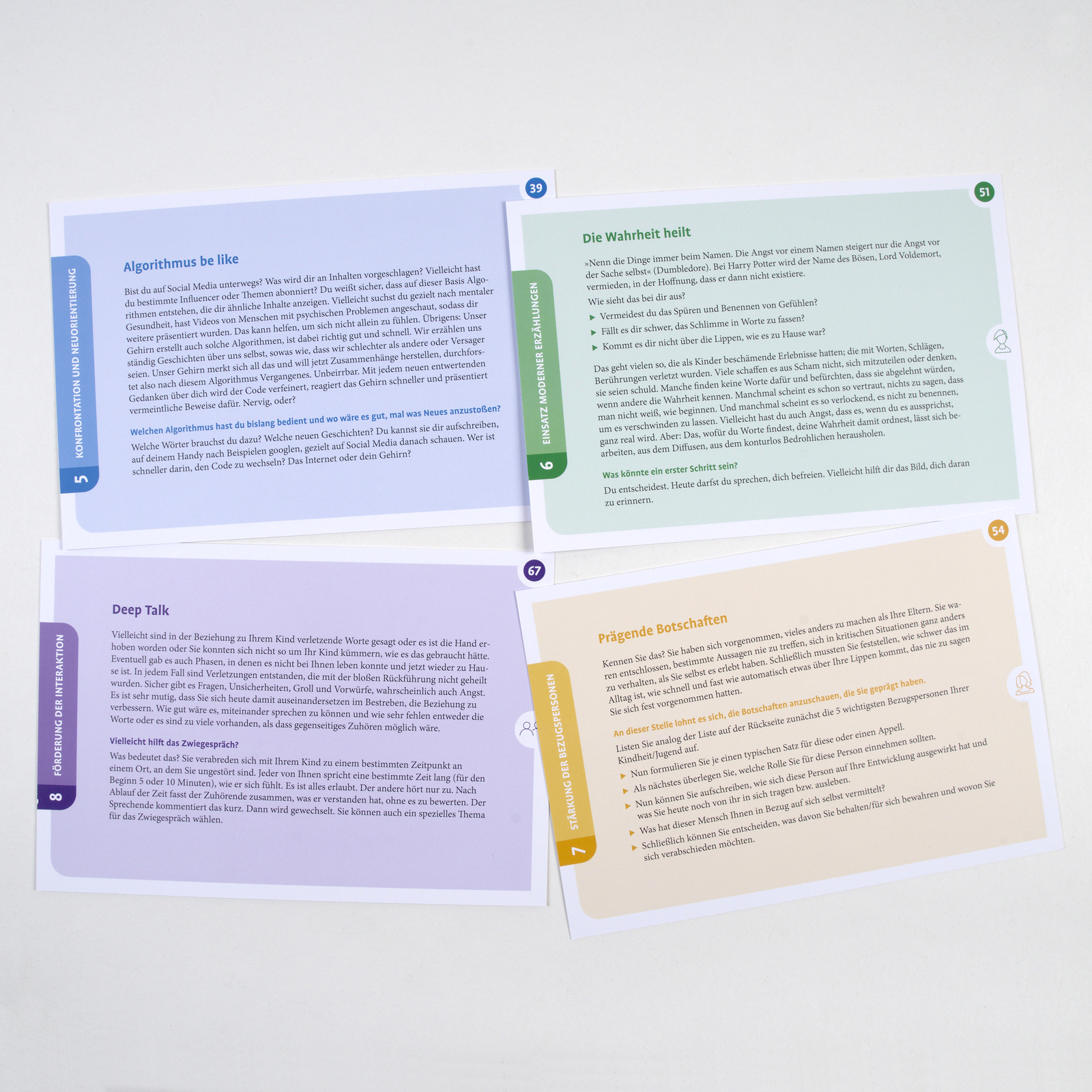 Sichere Bindung stellt einen Schutzfaktor für die psychische Entwicklung dar. Unsicherheiten in der Bindung bis hin zu Entwicklungstraumatisierungen können hingegen tiefgreifende Auswirkungen auf Identität und Selbstwert sowie Emotionsregulation haben. Die Übungen des Kartensets zielen darauf ab, die Körperwahrnehmung zu fördern, Emotionen und Impulse zu regulieren, Mitgefühl mit sich selbst zu entwickeln, gesunde Beziehungen zu erkennen und belastende Erfahrungen zu bearbeiten. Ein Schwerpunkt liegt auf der Förderung der Interaktion und Beziehungsqualität mit Bezugspersonen sowie auf der Arbeit mit diesen.