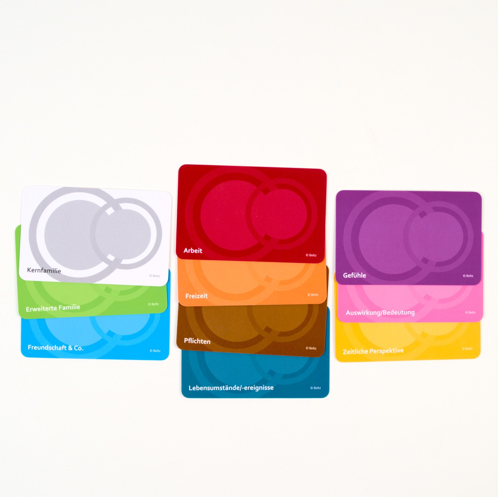 Das Visualisieren von Beziehungen, von Rollen, Konflikten und Wertigkeiten kann im therapeutischen und beraterischen Prozess sehr hilfreich sein. Mit den 200 Textkarten kann ein Genogramm mit anderen Lebensbereichen wie Arbeit oder Freundschaft kombiniert werden. Weitere Kategorien – etwa Lebensereignisse, Pflichten, Gefühle – ermöglichen, Konflikte oder Rollenkonfusionen zu erkennen sowie Veränderungswünsche für das weitere Leben zu formulieren.