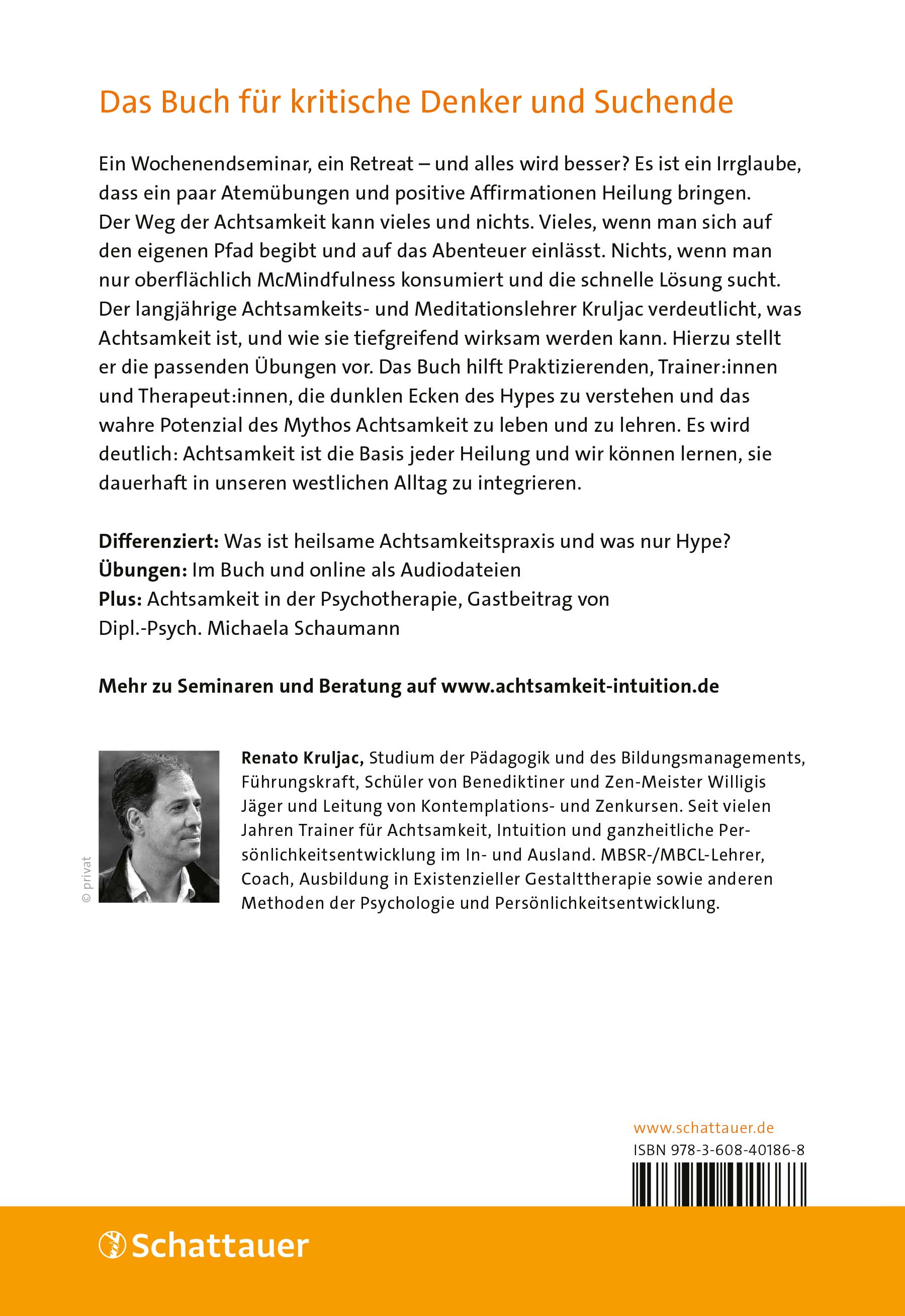 Ein Wochenendseminar, ein Retreat – und alles wird besser? Es ist ein Irrglaube, dass ein paar Atemübungen und positive Affirmationen Heilung bringen. Der Weg der Achtsamkeit kann vieles und nichts. Vieles, wenn man sich auf den eigenen Pfad begibt und auf das Abenteuer einlässt. Nichts, wenn man nur oberflächlich McMindfulness konsumiert und die schnelle Lösung sucht. Der langjährige Achtsamkeits- und Meditationslehrer Kruljac verdeutlicht, was Achtsamkeit ist, und wie sie tiefgreifend wirksam werden kann. Hierzu stellt er die passenden Übungen vor. Das Buch hilft Praktizierenden, Trainer:innen und Therapeut:innen, die dunklen Ecken des Hypes zu verstehen und das wahre Potenzial des Mythos Achtsamkeit zu leben und zu lehren. Es wird deutlich: Achtsamkeit ist die Basis jeder Heilung und wir können lernen, sie dauerhaft in unseren westlichen Alltag zu integrieren.