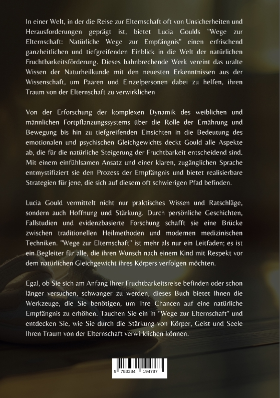 In einer Welt, in der die Reise zur Elternschaft oft von Unsicherheiten und Herausforderungen geprägt ist, bietet Lucia Goulds "Wege zur Elternschaft: Natürliche Wege zur Empfängnis" einen erfrischend ganzheitlichen und tiefgreifenden Einblick in die Welt der natürlichen Fruchtbarkeitsförderung. Dieses bahnbrechende Werk vereint das uralte Wissen der Naturheilkunde mit den neuesten Erkenntnissen aus der Wissenschaft, um Paaren und Einzelpersonen dabei zu helfen, ihren Traum von der Elternschaft zu verwirklichen.Von der Erforschung der komplexen Dynamik des weiblichen und männlichen Fortpflanzungssystems über die Rolle der Ernährung und Bewegung bis hin zu tiefgreifenden Einsichten in die Bedeutung des emotionalen und psychischen Gleichgewichts deckt Gould alle Aspekte ab, die für die natürliche Steigerung der Fruchtbarkeit entscheidend sind. Mit einem einfühlsamen Ansatz und einer klaren, zugänglichen Sprache entmystifiziert sie den Prozess der Empfängnis und bietet realisierbare Strategien für jene, die sich auf diesem oft schwierigen Pfad befinden.Lucia Gould vermittelt nicht nur praktisches Wissen und Ratschläge, sondern auch Hoffnung und Stärkung. Durch persönliche Geschichten, Fallstudien und evidenzbasierte Forschung schafft sie eine Brücke zwischen traditionellen Heilmethoden und modernen medizinischen Techniken. "Wege zur Elternschaft" ist mehr als nur ein Leitfaden; es ist ein Begleiter für alle, die ihren Wunsch nach einem Kind mit Respekt vor dem natürlichen Gleichgewicht ihres Körpers verfolgen möchten.Egal, ob Sie sich am Anfang Ihrer Fruchtbarkeitsreise befinden oder schon länger versuchen, schwanger zu werden, dieses Buch bietet Ihnen die Werkzeuge, die Sie benötigen, um Ihre Chancen auf eine natürliche Empfängnis zu erhöhen. Tauchen Sie ein in "Wege zur Elternschaft" und entdecken Sie, wie Sie durch die Stärkung von Körper, Geist und Seele Ihren Traum von der Elternschaft verwirklichen können.