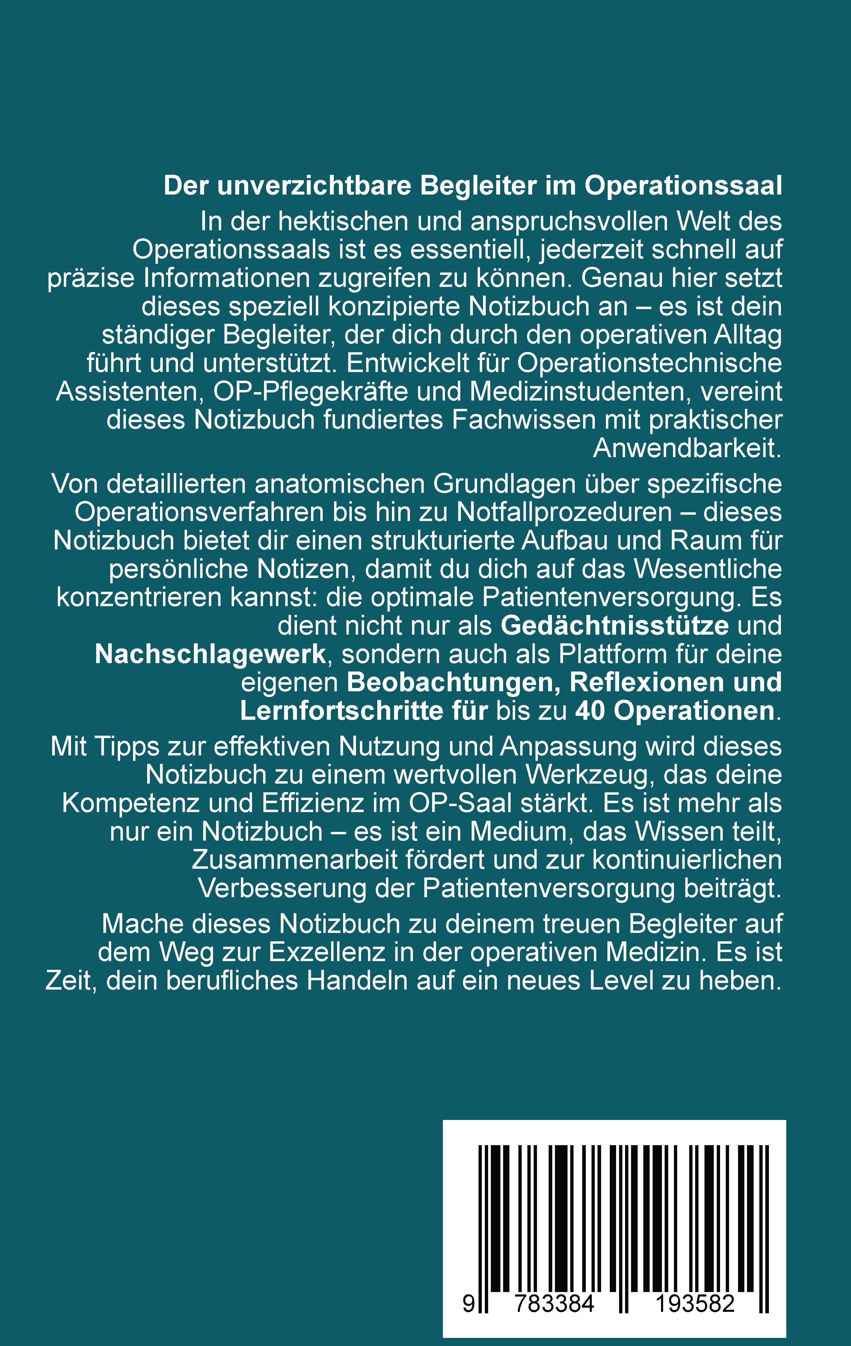| Schlagworte | chirurgische Instrumente • Medizinisches Notizbuch • Medizinstudenten • Medizinstudium • Notfallprozeduren • Notizbuch • Notizbuch für OP-Personal • Operationssaal • Operationstechnische Assistenten • Operationsverfahren • OP Personal • OP-Personal • OP-Saal Setting • OP Technik • OP-Technik • OTA • Patientenlagerung |