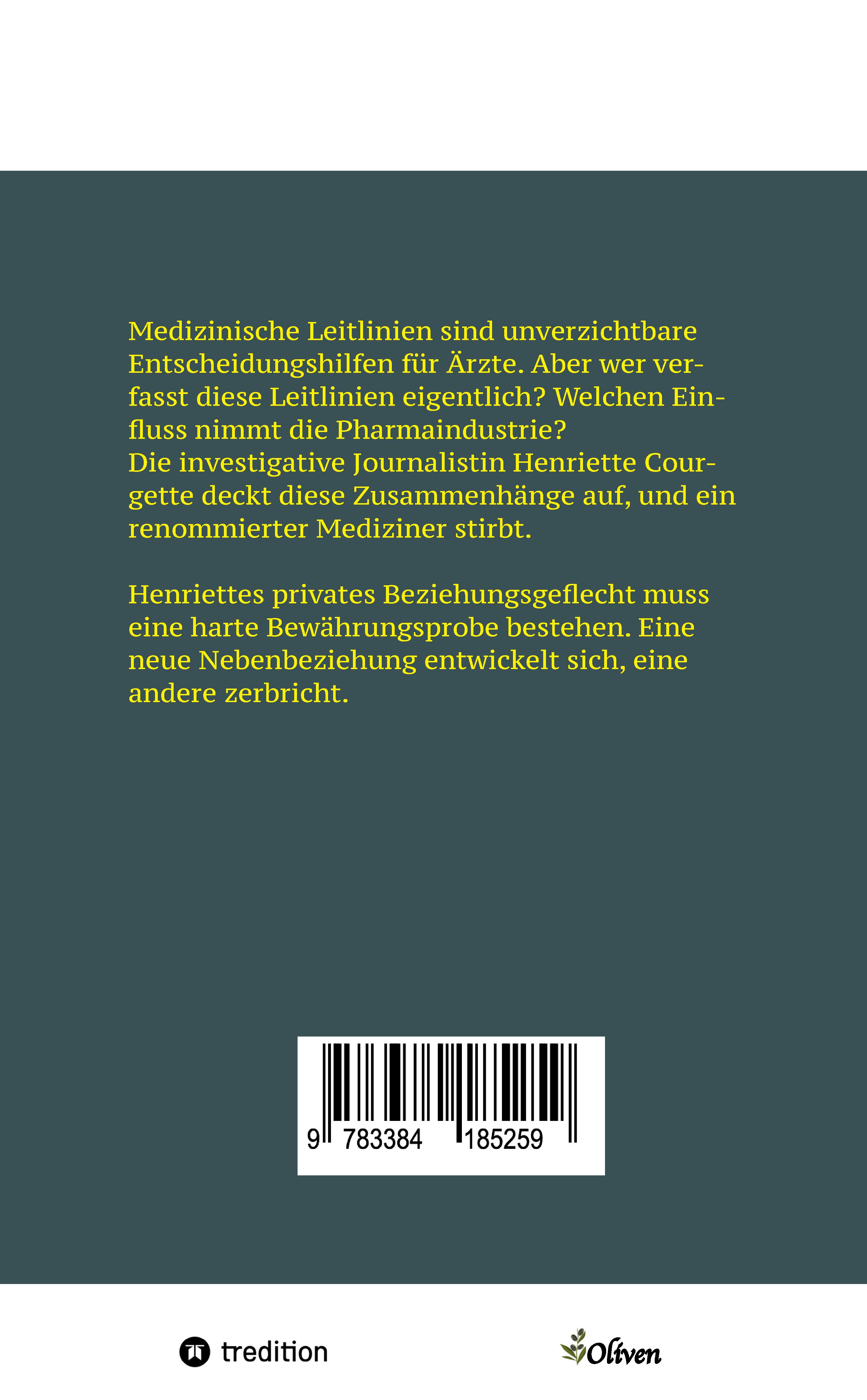 Medizinische Leitlinien sind unverzichtbare Entscheidungshilfen für Ärzte. Aber wer verfasst diese Leitlinien eigentlich? Welchen Einfluss nimmt die Pharmaindustrie?Die investigative Journalistin Henriette Courgette deckt diese Zusammenhänge auf, und ein renommierter Mediziner stirbt.Henriettes privates Beziehungsgeflecht muss eine harte Bewährungsprobe bestehen. Eine neue Nebenbeziehung entwickelt sich, eine andere zerbricht.