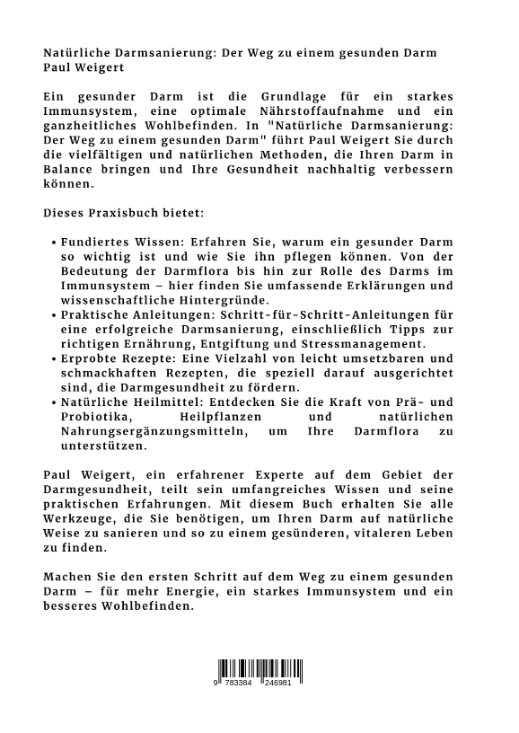 Ein gesunder Darm ist die Grundlage für ein starkes Immunsystem, eine optimale Nährstoffaufnahme und ein ganzheitliches Wohlbefinden. In "Natürliche Darmsanierung: Der Weg zu einem gesunden Darm" führt Paul Weigert Sie durch die vielfältigen und natürlichen Methoden, die Ihren Darm in Balance bringen und Ihre Gesundheit nachhaltig verbessern können.Dieses Praxisbuch bietet:* Fundiertes Wissen: Erfahren Sie, warum ein gesunder Darm so wichtig ist und wie Sie ihn pflegen können. Von der Bedeutung der Darmflora bis hin zur Rolle des Darms im Immunsystem - hier finden Sie umfassende Erklärungen und wissenschaftliche Hintergründe.* Praktische Anleitungen: Schritt-für-Schritt-Anleitungen für eine erfolgreiche Darmsanierung, einschließlich Tipps zur richtigen Ernährung, Entgiftung und Stressmanagement.* Erprobte Rezepte: Eine Vielzahl von leicht umsetzbaren und schmackhaften Rezepten, die speziell darauf ausgerichtet sind, die Darmgesundheit zu fördern.* Natürliche Heilmittel: Entdecken Sie die Kraft von Prä- und Probiotika, Heilpflanzen und natürlichen Nahrungsergänzungsmitteln, um Ihre Darmflora zu unterstützen.Paul Weigert, ein erfahrener Experte auf dem Gebiet der Darmgesundheit, teilt sein umfangreiches Wissen und seine praktischen Erfahrungen. Mit diesem Buch erhalten Sie alle Werkzeuge, die Sie benötigen, um Ihren Darm auf natürliche Weise zu sanieren und so zu einem gesünderen, vitaleren Leben zu finden.Machen Sie den ersten Schritt auf dem Weg zu einem gesunden Darm - für mehr Energie, ein starkes Immunsystem und ein besseres Wohlbefinden.