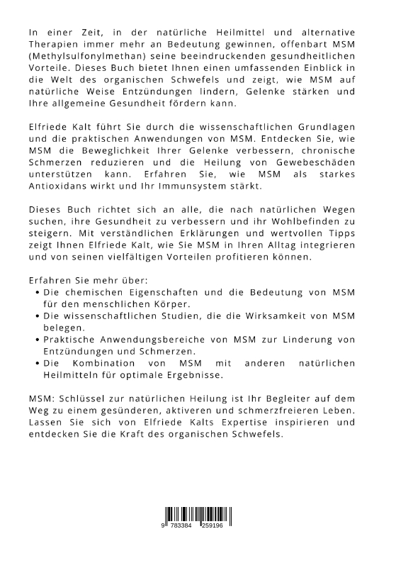 In einer Zeit, in der natürliche Heilmittel und alternative Therapien immer mehr an Bedeutung gewinnen, offenbart MSM (Methylsulfonylmethan) seine beeindruckenden gesundheitlichen Vorteile. Dieses Buch bietet Ihnen einen umfassenden Einblick in die Welt des organischen Schwefels und zeigt, wie MSM auf natürliche Weise Entzündungen lindern, Gelenke stärken und Ihre allgemeine Gesundheit fördern kann.Elfriede Kalt führt Sie durch die wissenschaftlichen Grundlagen und die praktischen Anwendungen von MSM. Entdecken Sie, wie MSM die Beweglichkeit Ihrer Gelenke verbessern, chronische Schmerzen reduzieren und die Heilung von Gewebeschäden unterstützen kann. Erfahren Sie, wie MSM als starkes Antioxidans wirkt und Ihr Immunsystem stärkt.Dieses Buch richtet sich an alle, die nach natürlichen Wegen suchen, ihre Gesundheit zu verbessern und ihr Wohlbefinden zu steigern. Mit verständlichen Erklärungen und wertvollen Tipps zeigt Ihnen Elfriede Kalt, wie Sie MSM in Ihren Alltag integrieren und von seinen vielfältigen Vorteilen profitieren können.Erfahren Sie mehr über:* Die chemischen Eigenschaften und die Bedeutung von MSM für den menschlichen Körper.* Die wissenschaftlichen Studien, die die Wirksamkeit von MSM belegen.* Praktische Anwendungsbereiche von MSM zur Linderung von Entzündungen und Schmerzen.* Die Kombination von MSM mit anderen natürlichen Heilmitteln für optimale Ergebnisse.MSM: Schlüssel zur natürlichen Heilung ist Ihr Begleiter auf dem Weg zu einem gesünderen, aktiveren und schmerzfreieren Leben. Lassen Sie sich von Elfriede Kalts Expertise inspirieren und entdecken Sie die Kraft des organischen Schwefels.