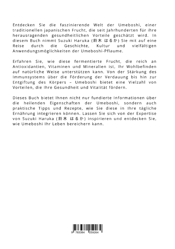Entdecken Sie die faszinierende Welt der Umeboshi, einer traditionellen japanischen Frucht, die seit Jahrhunderten für ihre herausragenden gesundheitlichen Vorteile geschätzt wird. In diesem Buch nimmt Suzuki Haruka ( ) Sie mit auf eine Reise durch die Geschichte, Kultur und vielfältigen Anwendungsmöglichkeiten der Umeboshi-Pflaume.Erfahren Sie, wie diese fermentierte Frucht, die reich an Antioxidantien, Vitaminen und Mineralien ist, Ihr Wohlbefinden auf natürliche Weise unterstützen kann. Von der Stärkung des Immunsystems über die Förderung der Verdauung bis hin zur Entgiftung des Körpers - Umeboshi bietet eine Vielzahl von Vorteilen, die Ihre Gesundheit und Vitalität fördern.Dieses Buch bietet Ihnen nicht nur fundierte Informationen über die heilenden Eigenschaften der Umeboshi, sondern auch praktische Tipps und Rezepte, wie Sie diese in Ihre tägliche Ernährung integrieren können. Lassen Sie sich von der Expertise von Suzuki Haruka ( ) inspirieren und entdecken Sie, wie Umeboshi Ihr Leben bereichern kann.