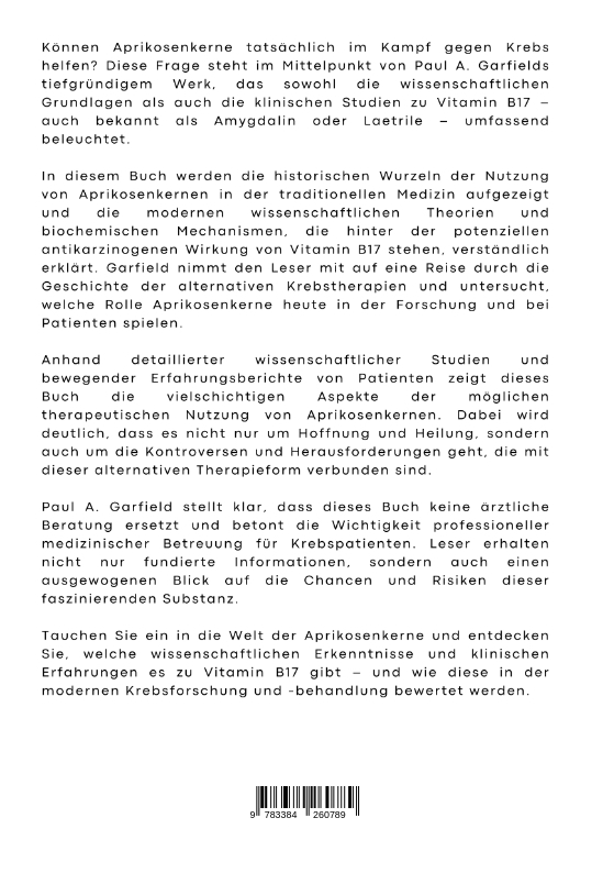 Können Aprikosenkerne tatsächlich im Kampf gegen Krebs helfen? Diese Frage steht im Mittelpunkt von Paul A. Garfields tiefgründigem Werk, das sowohl die wissenschaftlichen Grundlagen als auch die klinischen Studien zu Vitamin B17 - auch bekannt als Amygdalin oder Laetrile - umfassend beleuchtet.In diesem Buch werden die historischen Wurzeln der Nutzung von Aprikosenkernen in der traditionellen Medizin aufgezeigt und die modernen wissenschaftlichen Theorien und biochemischen Mechanismen, die hinter der potenziellen antikarzinogenen Wirkung von Vitamin B17 stehen, verständlich erklärt. Garfield nimmt den Leser mit auf eine Reise durch die Geschichte der alternativen Krebstherapien und untersucht, welche Rolle Aprikosenkerne heute in der Forschung und bei Patienten spielen.Anhand detaillierter wissenschaftlicher Studien und bewegender Erfahrungsberichte von Patienten zeigt dieses Buch die vielschichtigen Aspekte der möglichen therapeutischen Nutzung von Aprikosenkernen. Dabei wird deutlich, dass es nicht nur um Hoffnung und Heilung, sondern auch um die Kontroversen und Herausforderungen geht, die mit dieser alternativen Therapieform verbunden sind.Paul A. Garfield stellt klar, dass dieses Buch keine ärztliche Beratung ersetzt und betont die Wichtigkeit professioneller medizinischer Betreuung für Krebspatienten. Leser erhalten nicht nur fundierte Informationen, sondern auch einen ausgewogenen Blick auf die Chancen und Risiken dieser faszinierenden Substanz.Tauchen Sie ein in die Welt der Aprikosenkerne und entdecken Sie, welche wissenschaftlichen Erkenntnisse und klinischen Erfahrungen es zu Vitamin B17 gibt - und wie diese in der modernen Krebsforschung und -behandlung bewertet werden.