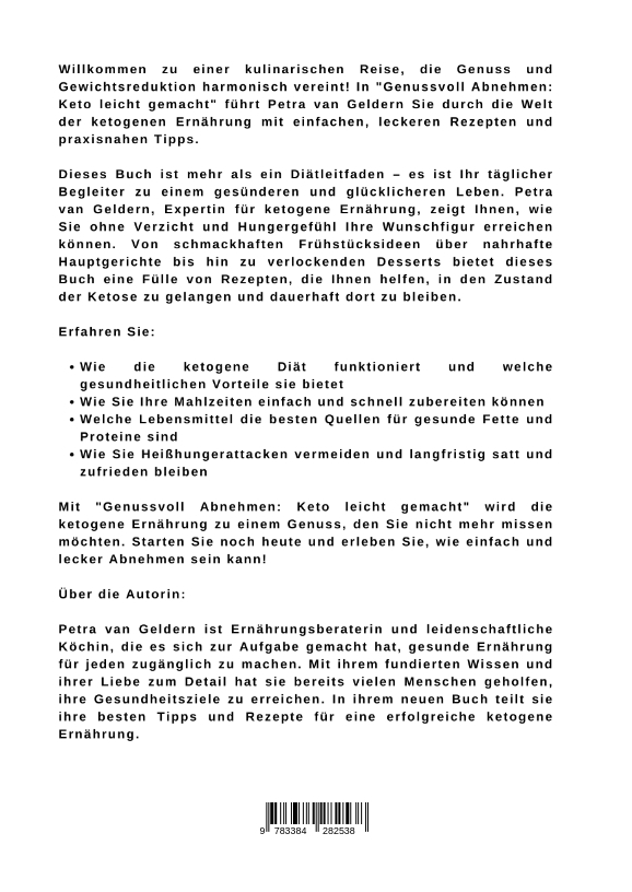 Willkommen zu einer kulinarischen Reise, die Genuss und Gewichtsreduktion harmonisch vereint! In "Genussvoll Abnehmen: Keto leicht gemacht" führt Petra van Geldern Sie durch die Welt der ketogenen Ernährung mit einfachen, leckeren Rezepten und praxisnahen Tipps.Dieses Buch ist mehr als ein Diätleitfaden - es ist Ihr täglicher Begleiter zu einem gesünderen und glücklicheren Leben. Petra van Geldern, Expertin für ketogene Ernährung, zeigt Ihnen, wie Sie ohne Verzicht und Hungergefühl Ihre Wunschfigur erreichen können. Von schmackhaften Frühstücksideen über nahrhafte Hauptgerichte bis hin zu verlockenden Desserts bietet dieses Buch eine Fülle von Rezepten, die Ihnen helfen, in den Zustand der Ketose zu gelangen und dauerhaft dort zu bleiben.Erfahren Sie:Wie die ketogene Diät funktioniert und welche gesundheitlichen Vorteile sie bietetWie Sie Ihre Mahlzeiten einfach und schnell zubereiten könnenWelche Lebensmittel die besten Quellen für gesunde Fette und Proteine sindWie Sie Heißhungerattacken vermeiden und langfristig satt und zufrieden bleibenMit "Genussvoll Abnehmen: Keto leicht gemacht" wird die ketogene Ernährung zu einem Genuss, den Sie nicht mehr missen möchten. Starten Sie noch heute und erleben Sie, wie einfach und lecker Abnehmen sein kann!