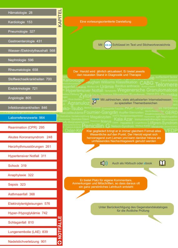 Der Herold Innere Medizin ist seit Jahren das Standardwerk für alle internistischen Fachrichtungen. Ob Studierende, AssistenzärztInnen oder PraktikerInnen, ob zum Nachschlagen, linearen Lesen oder zur Prüfungsvorbereitung - die klare Gliederung, das übersichtliche Layout und vor allem die Aktualität des jährlich neu erscheinenden Werkes machen den Herold zu einem unverzichtbaren Begleiter.