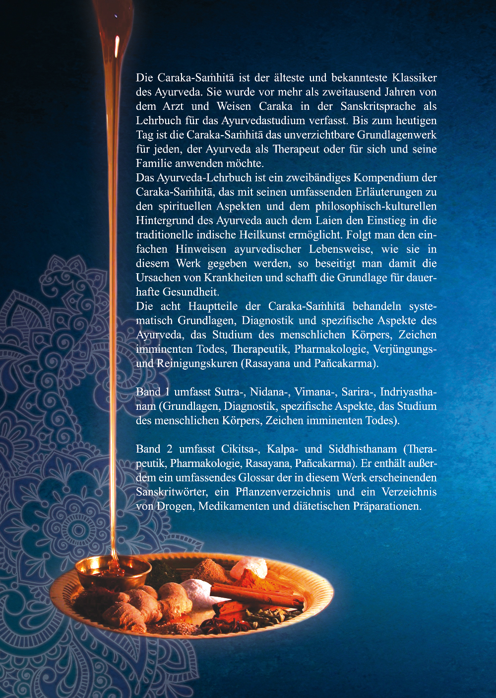 Die Charaka-Samhita ist der älteste und bekannteste Klassiker des Ayurveda. Sie wurde vor mehr als zweitausend Jahren von dem Arzt und Weisen Charaka in der Sanskritsprache als Lehrbuch für das Ayurvedastudium verfasst. Bis zum heutigen Tag ist die Charaka-Samhita das unverzichtbare Grundlagen-Werk für jeden, der Ayurveda als Therapeut oder für sich und seine Familie anwenden möchte. Das Ayurveda-Lehrbuch ist ein zweibändiges Kompendium der Charaka-Samhita, das mit seinen umfassenden Erläuterungen zu den spirituellen Aspekten und dem philosophisch-kulturellen Hintergrund des Ayurveda auch dem Laien den Einstieg in die traditionelle indische Heilkunst ermöglicht. Folgt man den einfachen Hinweisen ayurvedischer Lebensweise, wie sie in diesem Werk gegeben werden, so beseitigt man damit die Ursachen von Krankheiten und schafft die Grundalge für dauerhafte Gesundheit. Band 1 (488 Seiten) umfasst Sutra-, Nidana-, Vimana-, Sarira-, Indriyasthanam (Grundlagen, Diagnostik, spezifische Aspekte, das Studium des menschlichen Körpers, Zeichen imminenten Todes). Band 2 (432 Seiten) umfasst Cikitsa-, Kalpa- und Siddhisthanam (Therapeutik, Pharmakologie, Rasayana, Pancakarma). Er enthält außerdem ein umfassendes Glossar der in diesem Werk erscheinenden Sanskritwörter, ein Pflanzenverzeichnis und ein Verzeichnis von Drogen, Medikamenten und diätetischen Präparationen.