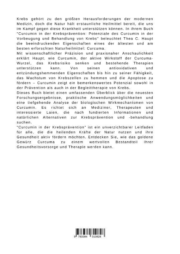 Krebs gehört zu den größten Herausforderungen der modernen Medizin, doch die Natur hält erstaunliche Heilmittel bereit, die uns im Kampf gegen diese Krankheit unterstützen können. In ihrem Buch "Curcumin in der Krebsprävention: Potenziale des Curcumin in der Vorbeugung und Behandlung von Krebs" beleuchtet Thea C. Haupt die beeindruckenden Eigenschaften eines der ältesten und am besten erforschten Naturheilmittel: Curcuma.Mit wissenschaftlicher Präzision und praxisnaher Anschaulichkeit erklärt Haupt, wie Curcumin, der aktive Wirkstoff der Curcuma-Wurzel, das Krebsrisiko senken und bestehende Therapien unterstützen kann. Von seinen antioxidativen und entzündungshemmenden Eigenschaften bis hin zu seiner Fähigkeit, das Wachstum von Krebszellen zu hemmen und die Apoptose zu fördern - Curcumin zeigt ein bemerkenswertes Potenzial sowohl in der Prävention als auch in der Begleittherapie von Krebs.Dieses Buch bietet einen umfassenden Überblick über die neuesten Forschungsergebnisse, praktische Anwendungsmöglichkeiten und eine tiefgehende Analyse der biologischen Wirkmechanismen von Curcumin. Es richtet sich an Mediziner, Therapeuten und interessierte Laien, die nach fundierten Informationen und natürlichen Alternativen zur Krebsprävention und -behandlung suchen."Curcumin in der Krebsprävention" ist ein unverzichtbarer Leitfaden für alle, die die heilenden Kräfte der Natur nutzen und ihre Gesundheit aktiv fördern möchten. Entdecken Sie, wie das goldene Gewürz Curcuma zu einem wertvollen Bestandteil Ihrer Gesundheitsvorsorge und Therapie werden kann.