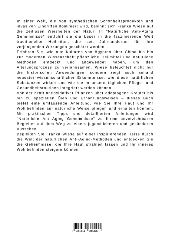 In einer Welt, die von synthetischen Schönheitsprodukten und invasiven Eingriffen dominiert wird, besinnt sich Franka Wiese auf die zeitlosen Weisheiten der Natur. In "Natürliche Anti-Aging Geheimnisse" entführt sie die Leser in die faszinierende Welt traditioneller Heilmittel, die seit Jahrhunderten für ihre verjüngenden Wirkungen geschätzt werden.Erfahren Sie, wie alte Kulturen von Ägypten über China bis hin zur modernen Wissenschaft pflanzliche Heilmittel und natürliche Methoden entdeckt und angewendet haben, um den Alterungsprozess zu verlangsamen. Wiese beleuchtet nicht nur die historischen Anwendungen, sondern zeigt auch anhand neuester wissenschaftlicher Erkenntnisse, wie diese natürlichen Substanzen wirken und wie sie in unsere täglichen Pflege- und Gesundheitsroutinen integriert werden können.Von der Kraft antioxidativer Pflanzen über adaptogene Kräuter bis hin zu speziellen Ölen und Ernährungsweisen - dieses Buch bietet eine umfassende Anleitung, wie Sie Ihre Haut und Ihr Wohlbefinden auf natürliche Weise pflegen und erhalten können. Mit praktischen Tipps und detaillierten Anleitungen wird "Natürliche Anti-Aging Geheimnisse" zu Ihrem unverzichtbaren Begleiter auf dem Weg zu einem jugendlicheren und gesünderen Aussehen.Begleiten Sie Franka Wiese auf einer inspirierenden Reise durch die Welt der natürlichen Anti-Aging-Methoden und entdecken Sie die Geheimnisse, die Ihre Haut strahlen lassen und Ihr inneres Wohlbefinden steigern können.