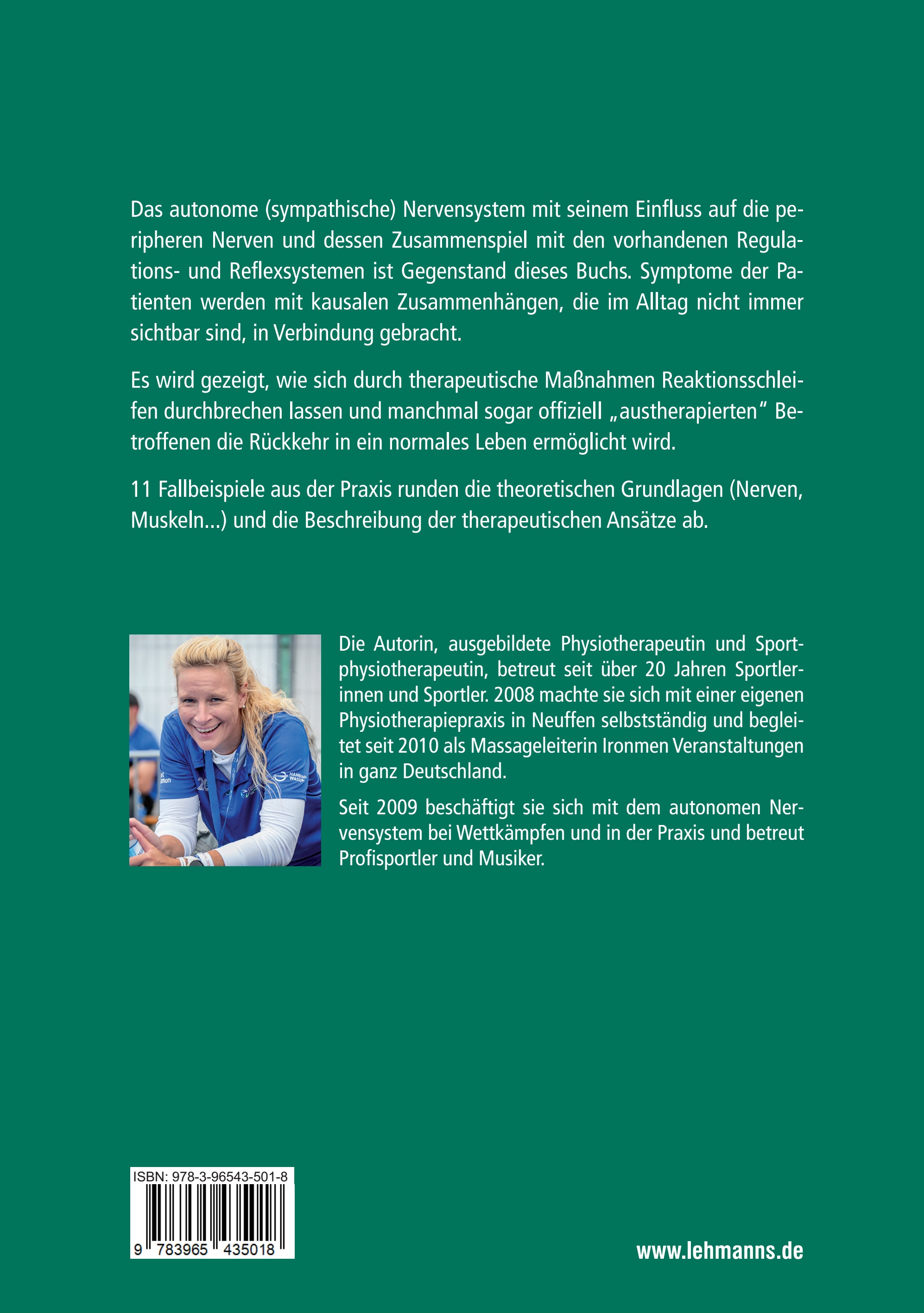 Die Autorin, ausgebildete Physiotherapeutin und Sportphysiotherapeutin, betreut seit über 20 Jahren Sportlerinnen und Sportler. 2008 machte sie sich mit einer eigenen Physiotherapiepraxis in Neuffen selbstständig und begleitet seit 2010 als Massageleiterin Ironmen Veranstaltungen in ganz Deutschland. Seit 2009 beschäftigt sie sich mit dem autonomen Nervensystem bei Wettkämpfen und in der Praxis und betreut Profisportler und Musiker.