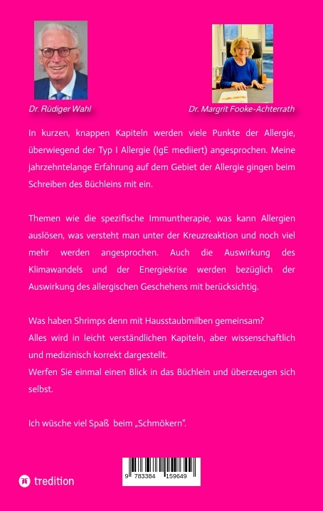 Seit über 40 Jahren beschäftige ich mich mit der Allergie. Ich arbeitete in der Forschung und Entwicklung in verschiedenen Hamburger Allergiefirmen. Ich habe über 200 Publikationen in nationalen und internationalen Journalen geschrieben, auf englischer und deutscher Sprache und mit diesem Buch vier Allergiebücher. Mein Ziel war es immer schwer verständliche „Dinge“ leicht verständlich darzustellen und kein Buch sollte über 20€ kosten. Ich meine, das mir das gelungen ist. Auf nationalen und internationalen Kongressen und vor Ärzten/innen habe ich an die 800 Vorträge in englischer und deutscher Sprache gehalten. Ich habe mir diverse spezifische IgE Messsysteme ausgedacht und entwickelt, wie den Streifentest Allergodip®, für den ich ein Patent bekam und den Magic Stick (INA, individuelle native Allergie Diagnostik). Für diese Weltneuheit bekam ich beim Deutschen Allergie Kongress 2012 in München den ersten Preis. Ich bin auf viele Allergene gestoßen, die Allergien auslösen könne, wie z.B. die Gummibärchenallergene (Gelatine). Zu TV Hamburg 1 wurde ich oft zum Thema Allergie eingeladen und stellte dort auch meine Bücher vor, nicht nur Allergiebücher. Auch habe ich auch an die 400 Gedichte geschrieben, dazu einige zum Thema Allergie. Das Milbengedicht können sie in dem Buch „Das ultimative Milbenbuch“ lesen. Sie sehen mein Herz gehört der Allergie, die ich auch mit eigenen Songs auf meiner CD Long live allergy besungen habe. Ich habe noch ein paar interessante Ideen auch zur spezifischen Immuntherapie, kontaktieren sei mich einfach, aber auch zu einem COVID 19 Schnelltest, deren Plattform auch für die Diagnostik anderer Krankheiten eingesetzt werden kann. Mehr Details zu meiner Person können sie www.allergie-experte-und-poet.de, entnehmen, die bei Bedarf immer weiter ausgebaut wir, jetzt mit „Das ultimative Milbenbuch“. Anmerken möchte ich noch, dass ich ein sehr gläubiger Mensch bin und alles IHM zu verdanken habe, dafür bin ich IHM sehr dankbar. Ahoi von der Alster Dr. Rüdiger Wahl