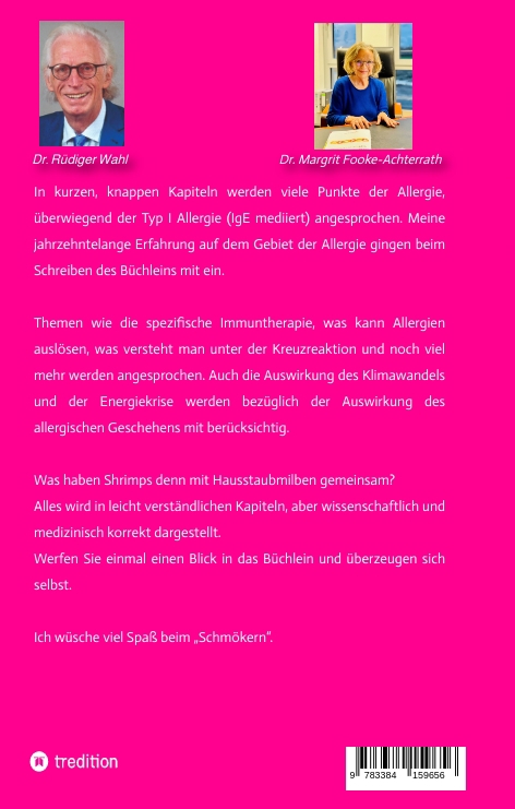 Seit über 40 Jahren beschäftige ich mich mit der Allergie. Ich arbeitete in der Forschung und Entwicklung in verschiedenen Hamburger Allergiefirmen. Ich habe über 200 Publikationen in nationalen und internationalen Journalen geschrieben, auf englischer und deutscher Sprache und mit diesem Buch vier Allergiebücher. Mein Ziel war es immer schwer verständliche „Dinge“ leicht verständlich darzustellen und kein Buch sollte über 20€ kosten. Ich meine, das mir das gelungen ist. Auf nationalen und internationalen Kongressen und vor Ärzten/innen habe ich an die 800 Vorträge in englischer und deutscher Sprache gehalten. Ich habe mir diverse spezifische IgE Messsysteme ausgedacht und entwickelt, wie den Streifentest Allergodip®, für den ich ein Patent bekam und den Magic Stick (INA, individuelle native Allergie Diagnostik). Für diese Weltneuheit bekam ich beim Deutschen Allergie Kongress 2012 in München den ersten Preis. Ich bin auf viele Allergene gestoßen, die Allergien auslösen könne, wie z.B. die Gummibärchenallergene (Gelatine). Zu TV Hamburg 1 wurde ich oft zum Thema Allergie eingeladen und stellte dort auch meine Bücher vor, nicht nur Allergiebücher. Auch habe ich auch an die 400 Gedichte geschrieben, dazu einige zum Thema Allergie. Das Milbengedicht können sie in dem Buch „Das ultimative Milbenbuch“ lesen. Sie sehen mein Herz gehört der Allergie, die ich auch mit eigenen Songs auf meiner CD Long live allergy besungen habe. Ich habe noch ein paar interessante Ideen auch zur spezifischen Immuntherapie, kontaktieren sei mich einfach, aber auch zu einem COVID 19 Schnelltest, deren Plattform auch für die Diagnostik anderer Krankheiten eingesetzt werden kann. Mehr Details zu meiner Person können sie www.allergie-experte-und-poet.de, entnehmen, die bei Bedarf immer weiter ausgebaut wir, jetzt mit „Das ultimative Milbenbuch“. Anmerken möchte ich noch, dass ich ein sehr gläubiger Mensch bin und alles IHM zu verdanken habe, dafür bin ich IHM sehr dankbar. Ahoi von der Alster Dr. Rüdiger Wahl