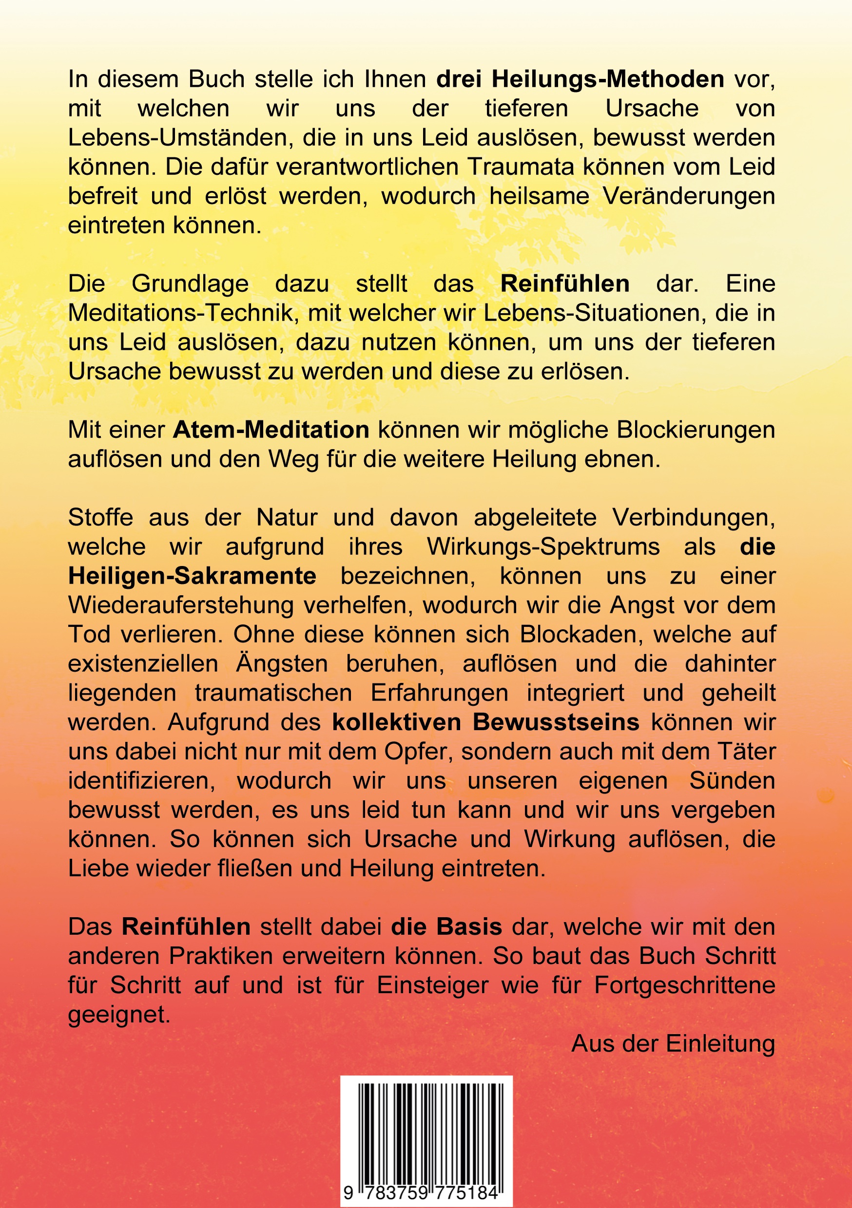 In diesem Buch stelle ich euch drei Heilungsmethoden vor. Mit diesen können wir uns der tieferen Ursache von seelischen, wie körperlichen und gesellschaftlichen Leiden bewusst werden, diese erlösen und heilsame Veränderungen bewirken. Die Methoden existieren bereits seit Jahrtausenden, sind aber durch den aufkommenden Materialismus immer mehr in Vergessenheit geraten.