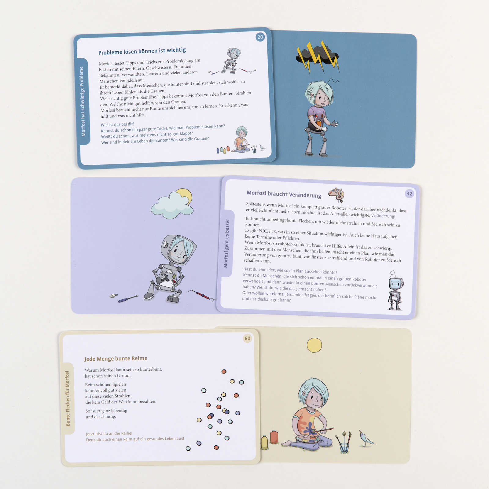Beim Auftreten von Depressionen verstehen die Kinder oft nicht, woher die Depression kommt und wie die Symptome entstehen. Der kleine Morfosi macht die Depression greifbarer. Mit der Begleitung von Morfosi lernen die Kinder, warum man mal mehr, mal weniger Gefühle empfindet, welche Gründe es dafür gibt und wie man es beeinflussen kann.