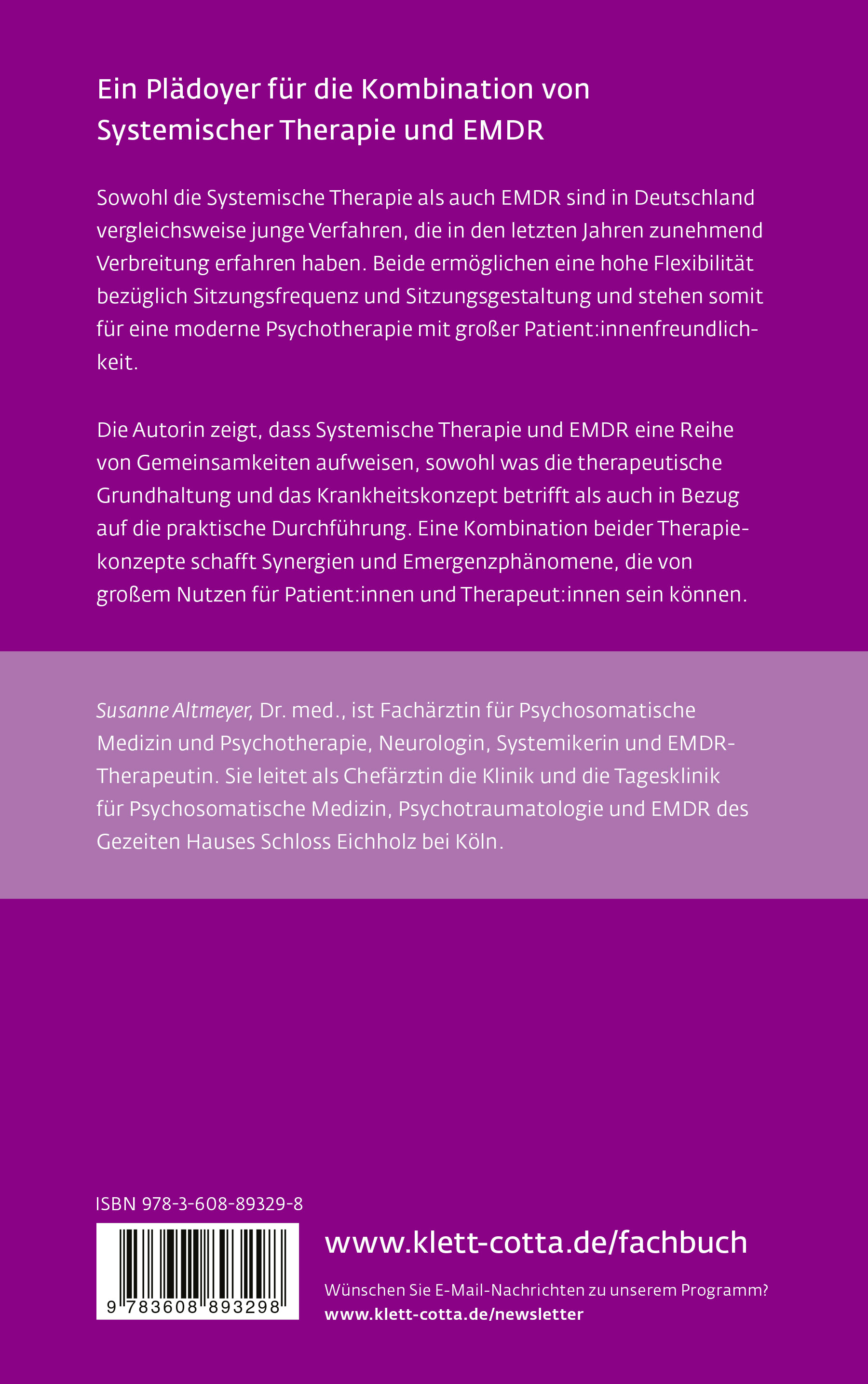 Susanne Altmeyer, Dr. med., ist Fachärztin für Psychosomatische Medizin und Psychotherapie, Neurologin, Systemikerin und EMDR-Therapeutin. Sie leitet als Chefärztin die Klinik und die Tagesklinik für Psychosomatische Medizin, Psychotraumatologie und EMDR des Gezeiten Hauses Schloss Eichholz bei Köln.