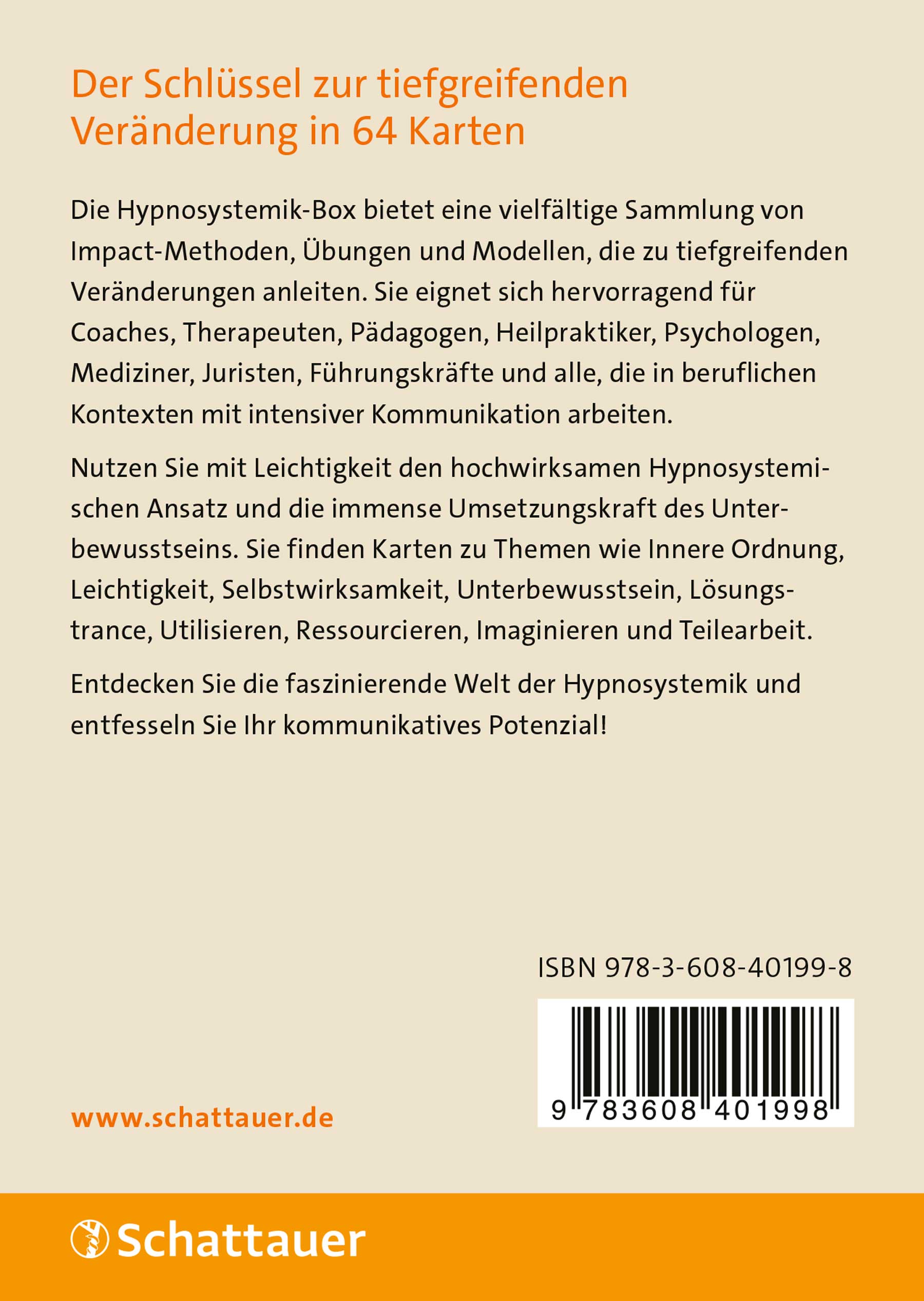 | Schlagworte | Coaching-Karten • Hypnosystemik-Box • Hypnosystemische Beratung • Hypnosystemischer Ansatz • Hypnosystemisches Coaching • Imagination • Impact-Methoden • Impact-Techniken • Kartenset Hypnosystemik • Kartenset Hypnotherapie • Kommunikation • Leichtigkeit • Lösungstrance • Selbstwirksamkeit • Teilearbeit • Unterbewusstsein • Veränderung |