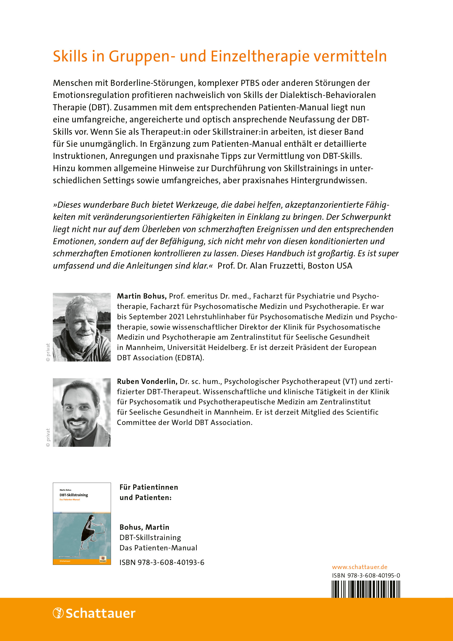 Ruben Vonderlin, Dr. sc. hum., Psychologischer Psychotherapeut (VT) und zertifizierter DBT-Therapeut. Wissenschaftliche und klinische Tätigkeit in der Klinik für Psychosomatik und Psychotherapeutische Medizin am Zentralinstitut für Seelische Gesundheit in Mannheim. Er ist derzeit Mitglied des Scientific Committee der World DBT Association.