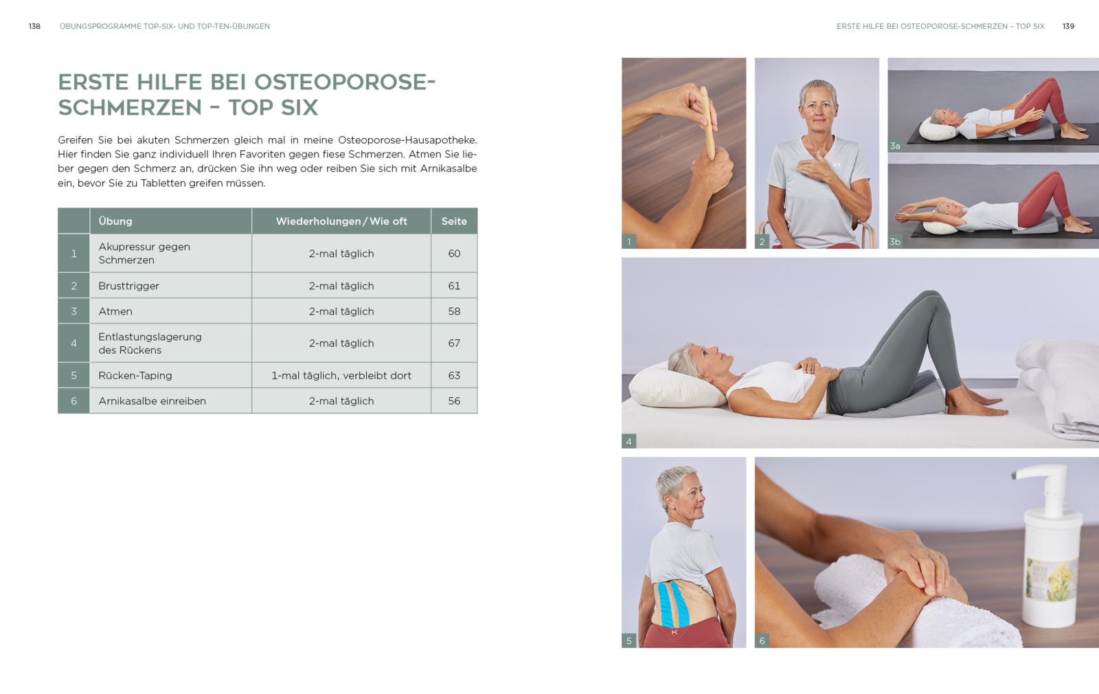 Die Übungen werden dabei zu effektiven Programmen zusammengesetzt, die für jedes Stadium der Krankheit und unterschiedliche Schmerz- und Beschwerdebilder ausgelegt sind wie- Knochenkräftigung,- Atembeschwerden und Schwindel,- aufrechte Haltung,- Sturzprävention oder- Osteoporose- und Osteopenieschmerzen.
