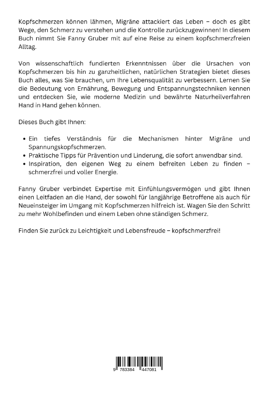 Kopfschmerzen können lähmen, Migräne attackiert das Leben - doch es gibt Wege, den Schmerz zu verstehen und die Kontrolle zurückzugewinnen! In diesem Buch nimmt Sie Fanny Gruber mit auf eine Reise zu einem kopfschmerzfreien Alltag.Von wissenschaftlich fundierten Erkenntnissen über die Ursachen von Kopfschmerzen bis hin zu ganzheitlichen, natürlichen Strategien bietet dieses Buch alles, was Sie brauchen, um Ihre Lebensqualität zu verbessern. Lernen Sie die Bedeutung von Ernährung, Bewegung und Entspannungstechniken kennen und entdecken Sie, wie moderne Medizin und bewährte Naturheilverfahren Hand in Hand gehen können.Dieses Buch gibt Ihnen:Ein tiefes Verständnis für die Mechanismen hinter Migräne und Spannungskopfschmerzen.Praktische Tipps für Prävention und Linderung, die sofort anwendbar sind.Inspiration, den eigenen Weg zu einem befreiten Leben zu finden - schmerzfrei und voller Energie.Fanny Gruber verbindet Expertise mit Einfühlungsvermögen und gibt Ihnen einen Leitfaden an die Hand, der sowohl für langjährige Betroffene als auch für Neueinsteiger im Umgang mit Kopfschmerzen hilfreich ist. Wagen Sie den Schritt zu mehr Wohlbefinden und einem Leben ohne ständigen Schmerz.Finden Sie zurück zu Leichtigkeit und Lebensfreude - kopfschmerzfrei!