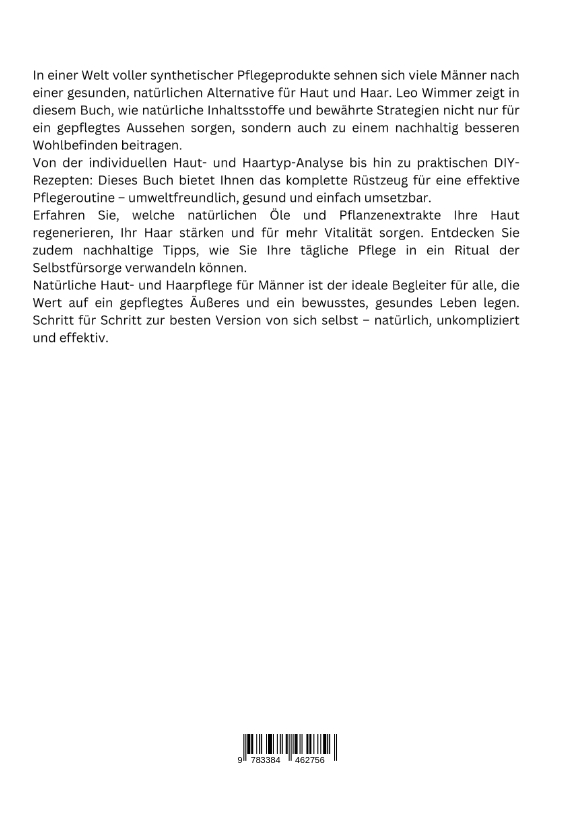 In einer Welt voller synthetischer Pflegeprodukte sehnen sich viele Männer nach einer gesunden, natürlichen Alternative für Haut und Haar. Leo Wimmer zeigt in diesem Buch, wie natürliche Inhaltsstoffe und bewährte Strategien nicht nur für ein gepflegtes Aussehen sorgen, sondern auch zu einem nachhaltig besseren Wohlbefinden beitragen.Von der individuellen Haut- und Haartyp-Analyse bis hin zu praktischen DIY-Rezepten: Dieses Buch bietet Ihnen das komplette Rüstzeug für eine effektive Pflegeroutine - umweltfreundlich, gesund und einfach umsetzbar.Erfahren Sie, welche natürlichen Öle und Pflanzenextrakte Ihre Haut regenerieren, Ihr Haar stärken und für mehr Vitalität sorgen. Entdecken Sie zudem nachhaltige Tipps, wie Sie Ihre tägliche Pflege in ein Ritual der Selbstfürsorge verwandeln können.Natürliche Haut- und Haarpflege für Männer ist der ideale Begleiter für alle, die Wert auf ein gepflegtes Äußeres und ein bewusstes, gesundes Leben legen. Schritt für Schritt zur besten Version von sich selbst - natürlich, unkompliziert und effektiv.