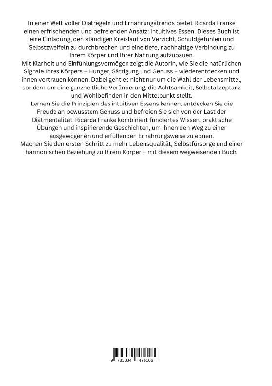 In einer Welt voller Diätregeln und Ernährungstrends bietet Ricarda Franke einen erfrischenden und befreienden Ansatz: Intuitives Essen. Dieses Buch ist eine Einladung, den ständigen Kreislauf von Verzicht, Schuldgefühlen und Selbstzweifeln zu durchbrechen und eine tiefe, nachhaltige Verbindung zu Ihrem Körper und Ihrer Nahrung aufzubauen.Mit Klarheit und Einfühlungsvermögen zeigt die Autorin, wie Sie die natürlichen Signale Ihres Körpers - Hunger, Sättigung und Genuss - wiederentdecken und ihnen vertrauen können. Dabei geht es nicht nur um die Wahl der Lebensmittel, sondern um eine ganzheitliche Veränderung, die Achtsamkeit, Selbstakzeptanz und Wohlbefinden in den Mittelpunkt stellt.Lernen Sie die Prinzipien des intuitiven Essens kennen, entdecken Sie die Freude an bewusstem Genuss und befreien Sie sich von der Last der Diätmentalität. Ricarda Franke kombiniert fundiertes Wissen, praktische Übungen und inspirierende Geschichten, um Ihnen den Weg zu einer ausgewogenen und erfüllenden Ernährungsweise zu ebnen.Machen Sie den ersten Schritt zu mehr Lebensqualität, Selbstfürsorge und einer harmonischen Beziehung zu Ihrem Körper - mit diesem wegweisenden Buch.Falls Sie Änderungen oder zusätzliche Schwerpunkte wünschen, passe ich den Text gerne an!