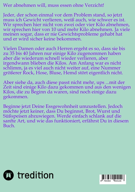 Im Buch "Langfristig abnehmen - sanft und gesund" geht es um nachhaltige und gesunde Methoden zur Gewichtsreduktion. Es legt den Fokus auf einen ganzheitlichen Ansatz, der nicht nur kurzfristige Diäten, sondern langfristige Veränderungen im Lebensstil fördert. Das Buch bietet praktische Tipps zur Ernährung, Bewegung und mentalen Einstellung, um ein gesundes Gewicht zu erreichen und zu halten.Es betont die Bedeutung von ausgewogener Ernährung, regelmäßiger körperlicher Aktivität und der Entwicklung eines positiven Körperbildes. Zudem werden Strategien vorgestellt, um Heißhungerattacken zu vermeiden und ein gesundes Verhältnis zum Essen aufzubauen. Ziel des Buches ist es, den Lesern zu helfen, ihre Gewichtsziele auf eine sanfte und nachhaltige Weise zu erreichen, ohne sich extremen Einschränkungen oder ungesunden Praktiken auszusetzen.