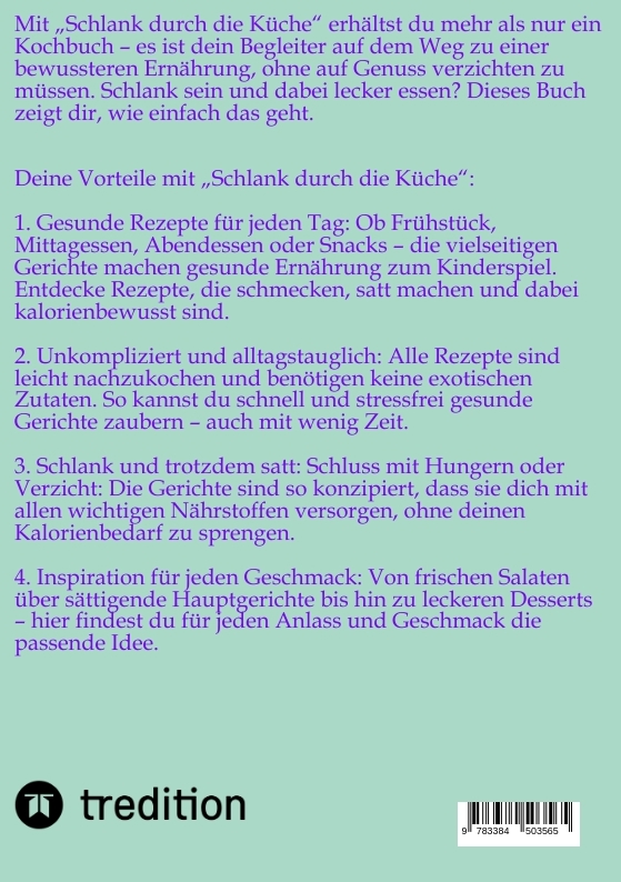 "Schlank durch die Küche" ist ein Buch, das sich mit gesunder Ernährung und dem Zubereiten von kalorienbewussten Gerichten beschäftigt. Es bietet in der Regel Rezepte und Tipps, wie man schmackhafte Mahlzeiten zubereiten kann, die gleichzeitig kalorienarm sind. Oftmals werden auch Informationen über Nährstoffe, Essgewohnheiten und die Bedeutung einer ausgewogenen Ernährung vermittelt.Das Buch richtet sich an Leser, die Gewicht verlieren oder ihr Gewicht halten möchten, ohne auf Genuss verzichten zu müssen. Es könnte auch Ratschläge zur Planung von Mahlzeiten und zur Verwendung frischer Zutaten enthalten. Ziel ist es, eine nachhaltige Ernährungsweise zu fördern, die sowohl gesund als auch lecker ist.