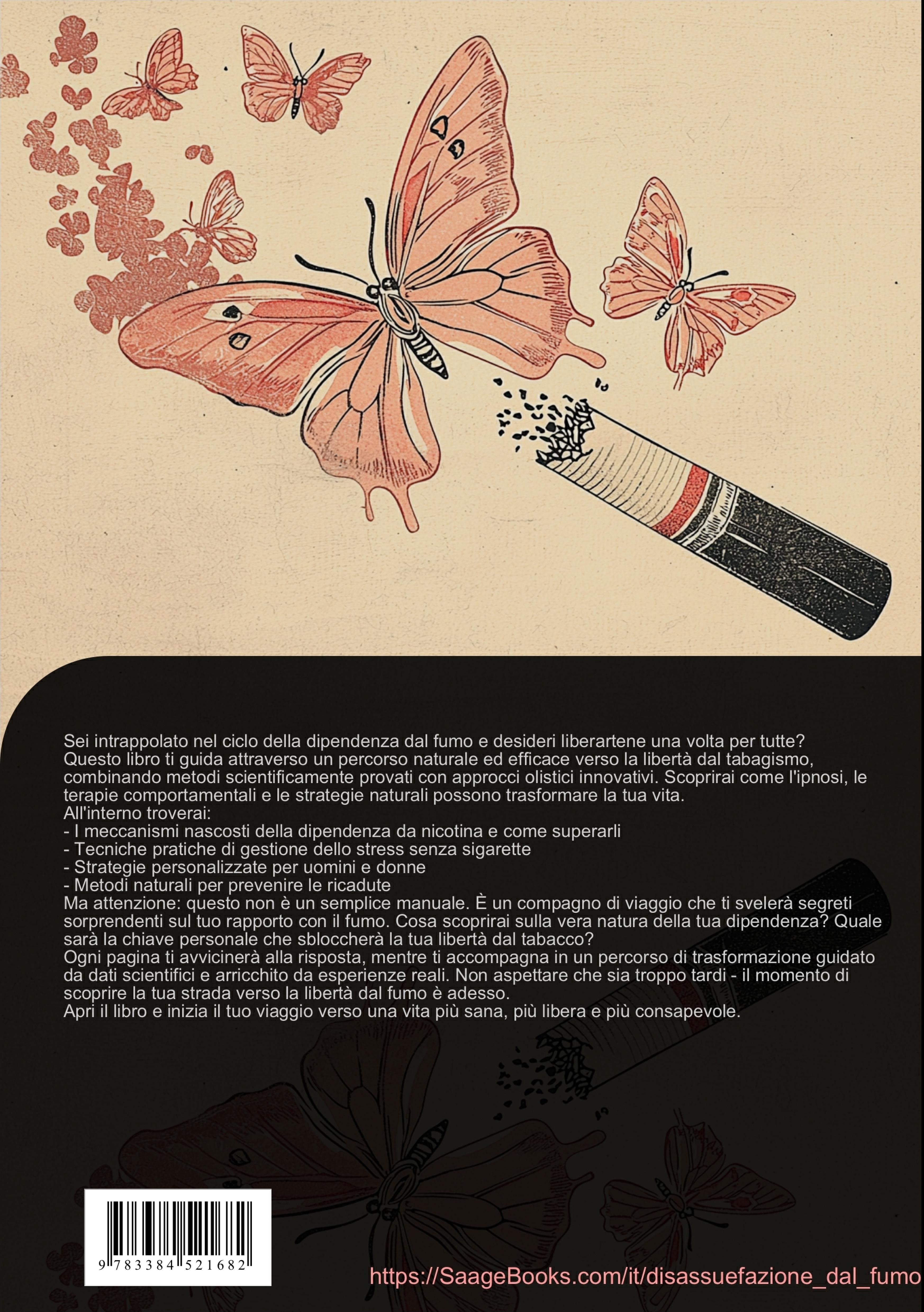Questo libro offre un approccio completo e naturale per smettere di fumare, presentando metodi efficaci e scientificamente fondati per superare la dipendenza dal tabagismo.La guida si articola in diverse sezioni che affrontano tutti gli aspetti del percorso verso una vita libera dal fumo:- Comprensione dei meccanismi biologici della dipendenza da nicotina e degli aspetti psicologici del tabagismo- Analisi dettagliata dei benefici per la salute dopo aver smesso di fumare, con focus sulla rigenerazione dell'organismo- Presentazione di metodi terapeutici diversificati, tra cui l'ipnosi per smettere di fumare, tecniche comportamentali e approcci naturali- Strategie pratiche per gestire le situazioni quotidiane senza sigarette, incluse tecniche di gestione dello stress- Considerazioni specifiche per uomini e donne nel processo di cessazione- Strumenti per prevenire le ricadute e mantenere i risultati a lungo termineIl libro fornisce strumenti concreti per:- Riconoscere e modificare i comportamenti automatici legati al fumo- Sviluppare nuove abitudini salutari- Utilizzare tecniche di rilassamento naturali- Gestire le situazioni sociali da non fumatoreQuesto libro per smettere di fumare è stato sviluppato combinando approcci tradizionali e moderne tecniche terapeutiche, rendendo più facile smettere di fumare attraverso un percorso graduale e personalizzabile.Scoprirai come è facile smettere di fumare quando si hanno gli strumenti giusti e una guida chiara da seguire.