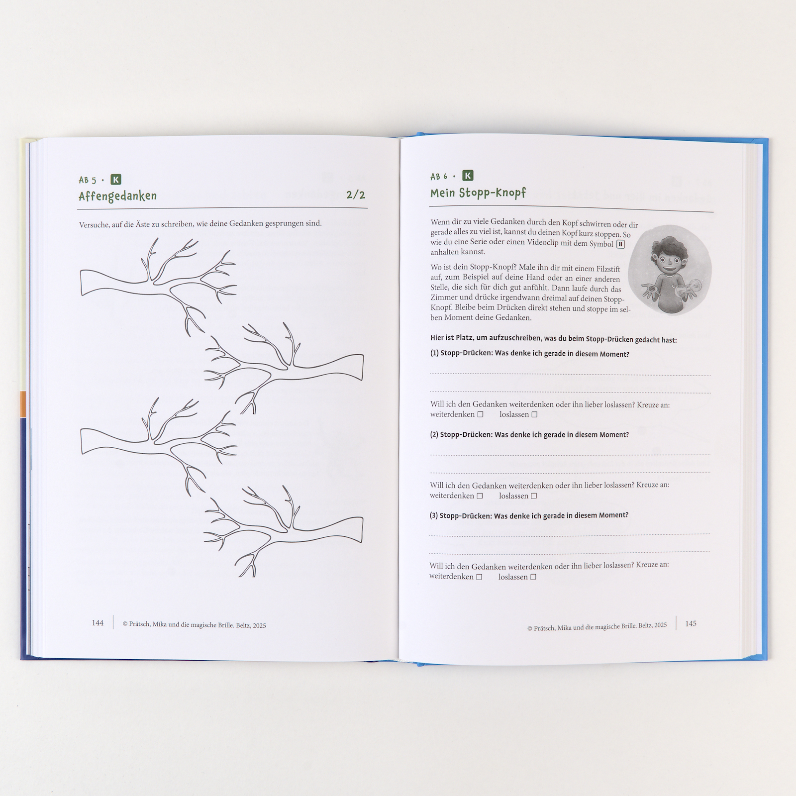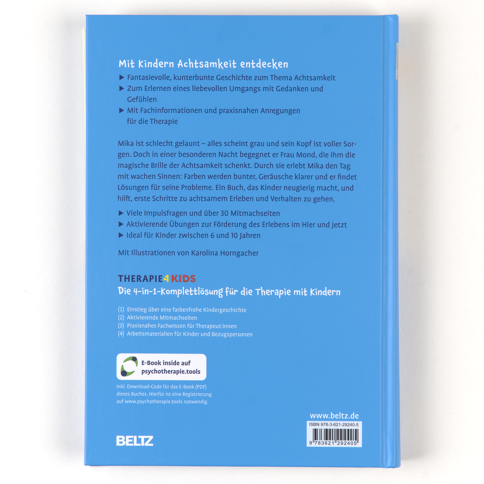 Mika ist schlecht gelaunt und nimmt seine Umgebung kaum wahr – alles scheint grau, und sein Kopf ist voller Gedanken. Eines Nachts schenkt ihm Frau Mond die magische Brille der Achtsamkeit. Durch sie erlebt Mika einen klareren, intensiveren Tag, nimmt die Welt mit wachen Sinnen wahr und findet Lösungen für seine Probleme. Das Buch weckt die Neugier der Kinder, Achtsamkeit für sich zu entdecken, und bietet mit passenden Arbeitsmaterialien sowie einem kinderfreundlichen Erklärteil spannende Anreize zum Üben.