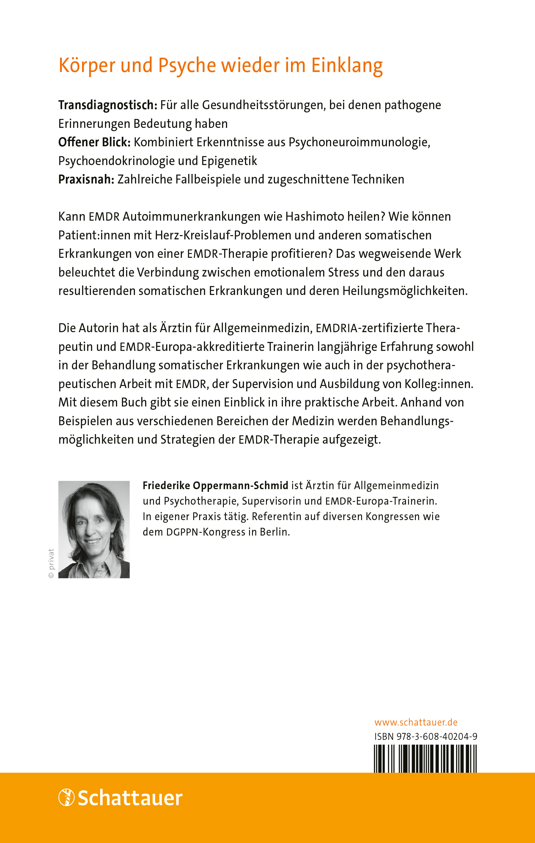 Die Autorin hat als Ärztin für Allgemeinmedizin, EMDRIA-zertifizierte Therapeutin und EMDR Europa akkreditierte Trainerin langjährige Erfahrung sowohl in der Behandlung somatischer Erkrankungen wie auch in der psychotherapeutischen Arbeit mit EMDR, der Supervision und Ausbildung von Kolleg:innen. Mit diesem Buch gibt sie einen Einblick in ihre praktische Arbeit. Anhand von Beispielen aus verschiedenen Bereichen der Medizin werden Behandlungsmöglichkeiten und Strategien der EMDR-Therapie aufgezeigt.