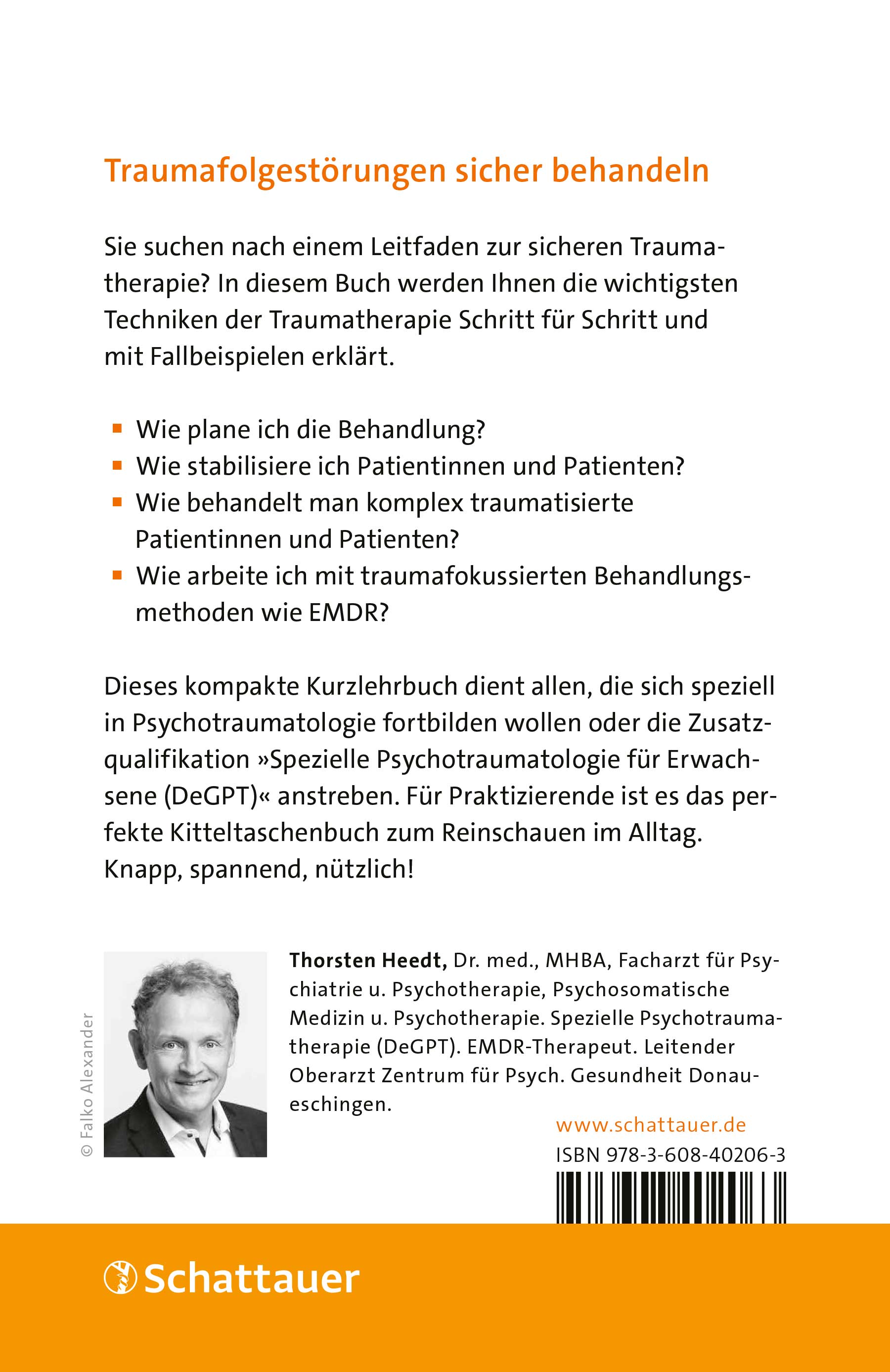 Thorsten Heedt, Dr. med. MHBA, Facharzt für Psychiatrie und Psychotherapie sowie Psychosomatische Medizin und Psychotherapie. Zertifizierter EMDR-Therapeut. Leitender Oberarzt der MediClin Klinik am Vogelsang. Klinische und wissenschaftliche Schwerpunkte: Depression, Trauma, insbesondere Behandlung mit EMDR, Borderline-Persönlichkeitsstörung.