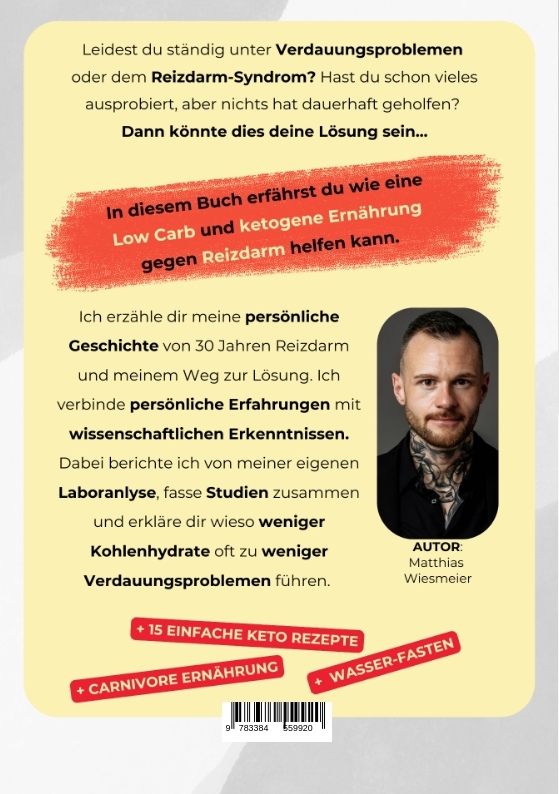 Leidest du unter dem Reizdarm-Syndrom und hast bisher keine dauerhafte Lösung gefunden? Vielleicht hilft dir, wie auch mir, eine ketogene Ernährung!In diesem Buch erfährst du auf 200 Seiten verständlich erklärt, warum weniger Kohlenhydrate auch weniger Reizdarm-Beschwerden bedeuten können. Ich teile mit dir meine persönliche Geschichte und erzähle, wie mir die ketogene Ernährung nach über 30 Jahren mit Reizdarm endlich geholfen hat. Dabei verbinde ich meine eigenen Erfahrungen mit wissenschaftlichen Erkenntnissen. Außerdem werte ich meine persönlichen Laboranalysen aus.Zusätzlich erhältst du 15 einfache Keto-Rezepte und lernst, wie sich auch die Carnivore-Ernährung und das Wasser-Fasten positiv auf deine Darmgesundheit auswirken können. Auch die Thematik rund um die FODMAPs bekommt ein Kapitel. Wenn du genug von Verdauungsproblemen, Bauchschmerzen, einem unangenehm aufgeblähten Bauch, Verstopfung und Durchfall hast, könnte mit diesem Buch endlich Schluss damit sein.Ehrlich, transparent, persönlich und wissenschaftlich - vielleicht findest auch du in diesem Buch endlich eine Lösung!