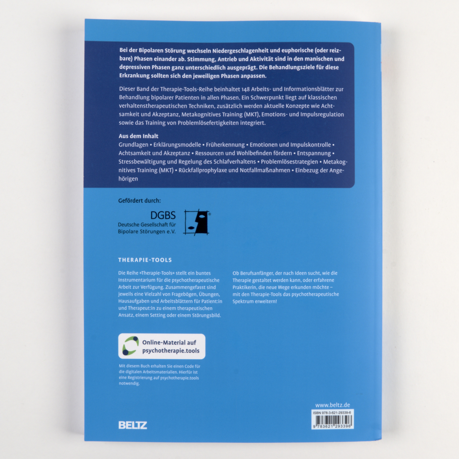Dieser Band der Therapie-Tools-Reihe beinhaltet 148 Arbeits- und Informationsblätter zur Behandlung bipolarer Patienten in allen Phasen. Ein Schwerpunkt liegt auf klassischen verhaltenstherapeutischen Techniken, zusätzlich werden aktuelle Konzepte wie Achtsamkeit und Akzeptanz, Metakognitives Training (MKT), Emotions- und Impulsregulation sowie das Training von Problemlösefertigkeiten integriert.