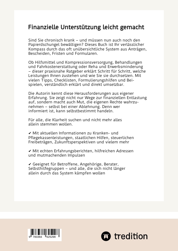 Sind Sie chronisch krank - und müssen nun auch noch den Papierdschungel bewältigen? Dieses Buch ist Ihr verlässlicher Kompass durch das oft unübersichtliche System aus Anträgen, Bescheiden, Fristen und Formularen.Ob Hilfsmittel und Kompressionsversorgung, Behandlungen und Fahrkostenerstattung oder Reha und Erwerbsminderung - dieser praxisnahe Ratgeber erklärt Schritt für Schritt, welche Leistungen Ihnen zustehen und wie Sie sie durchsetzen. Mit vielen Tipps, Checklisten, Formulierungshilfen und Beispielen, verständlich erklärt und direkt umsetzbar.Die Autorin kennt diese Herausforderungen aus eigener Erfahrung. Sie zeigt nicht nur Wege zur finanziellen Entlastung auf, sondern macht auch Mut, die eigenen Rechte wahrzunehmen - selbst bei einer Ablehnung. Denn wer informiert ist, kann selbstbestimmt handeln.Für alle, die Klarheit suchen und nicht mehr alles allein stemmen wollen. Mit aktuellen Informationen zu Kranken- und Pflegekassenleistungen, staatlichen Hilfen, steuerlichen Freibeträgen, Zukunftsperspektiven und vielem mehr Mit echten Erfahrungsberichten, hilfreichen Adressen und mutmachenden Impulsen Geeignet für Betroffene, Angehörige, Berater, Selbsthilfegruppen - und alle, die sich nicht länger allein durch das System kämpfen wollen