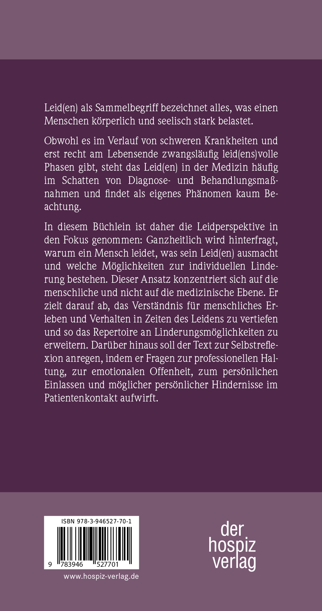 In diesem (Mut)Büchlein ist daher die Leidperspektive in den Fokus genommen: Ganzheitlich wird hinterfragt, warum ein Mensch leidet, was sein Leid(en) ausmacht und welche Möglichkeiten zur individuellen Linderung bestehen. Dieser Ansatz konzentriert sich auf die menschliche und nicht auf die medizinische Ebene. Er zielt darauf ab, das Verständnis für menschliches Erleben und Verhalten in Zeiten des Leidens zu vertiefen und so das Repertoire an Linderungsmöglichkeiten zu erweitern. Darüber hinaus soll der Text zur Selbstreflexion anregen, indem er Fragen zur professionellen Haltung, zur emotionalen Offenheit, zum persönlichen Einlassen und möglicher persönlicher Hindernisse im Patientenkontakt aufwirft.