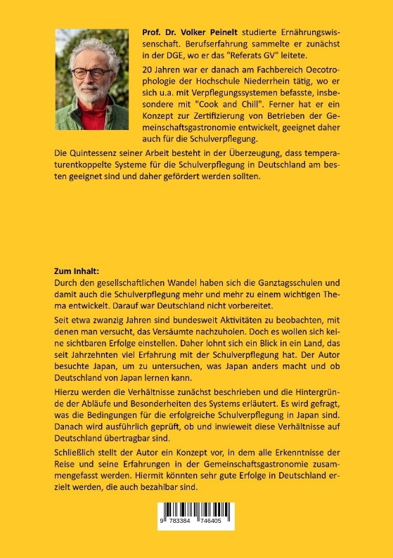 Volker Peinelt studierte Ernährungswissenschaft. Berufserfahrung sammelte er u. a. in der Deutschen Gesellschaft für Ernährung (DGE) als Leiter des Referats Gemeinschaftsverpflegung. 20 Jahren war er dann am Fachbereich Oecotrophologie an der Hochschule Niederrhein tätig, wo er sich schwerpunktmäßig mit Verpflegungssystemen befasst, insbesondere mit "Cook and Chill". Ferner hat er ein Konzept zur Zertifizierung von Betrieben der Gemeinschaftsgastronomie entwickelt, geeignet daher auch für die Schulverpflegung. Die letzte Aktivität war das "Gastronomische Ampelsystem", das Speisen leicht verständlich bewertet und kennzeichnet und auch in Schulen sehr gut anwendbar ist. Die Quintessenz seiner Arbeiten besteht in der Überzeugung, dass entkoppelte Systeme für die Schulverpflegung in Deutschland am geeignetsten sind und daher gefördert werden sollten.