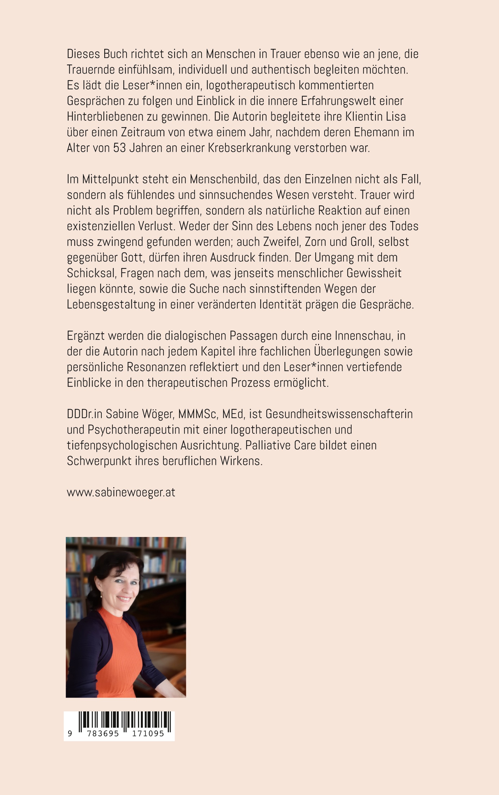 Dieses Buch richtet sich an Menschen in Trauer ebenso wie an jene, die Trauernde einfühlsam, individuell und authentisch begleiten möchten. Es lädt die Leser*innen ein, logotherapeutisch kommentierten Gesprächen zu folgen und Einblick in die innere Erfahrungswelt einer Hinterbliebenen zu gewinnen. Die Autorin begleitete ihre Klientin Lisa über einen Zeitraum von etwa einem Jahr, nachdem deren Ehemann im Alter von 53 Jahren an einer Krebserkrankung verstorben war.