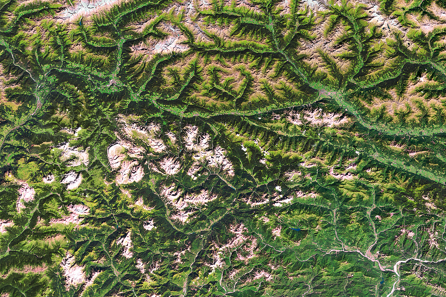 Satellitenbildkarte der Alpen in naturnaher Farbgebung: