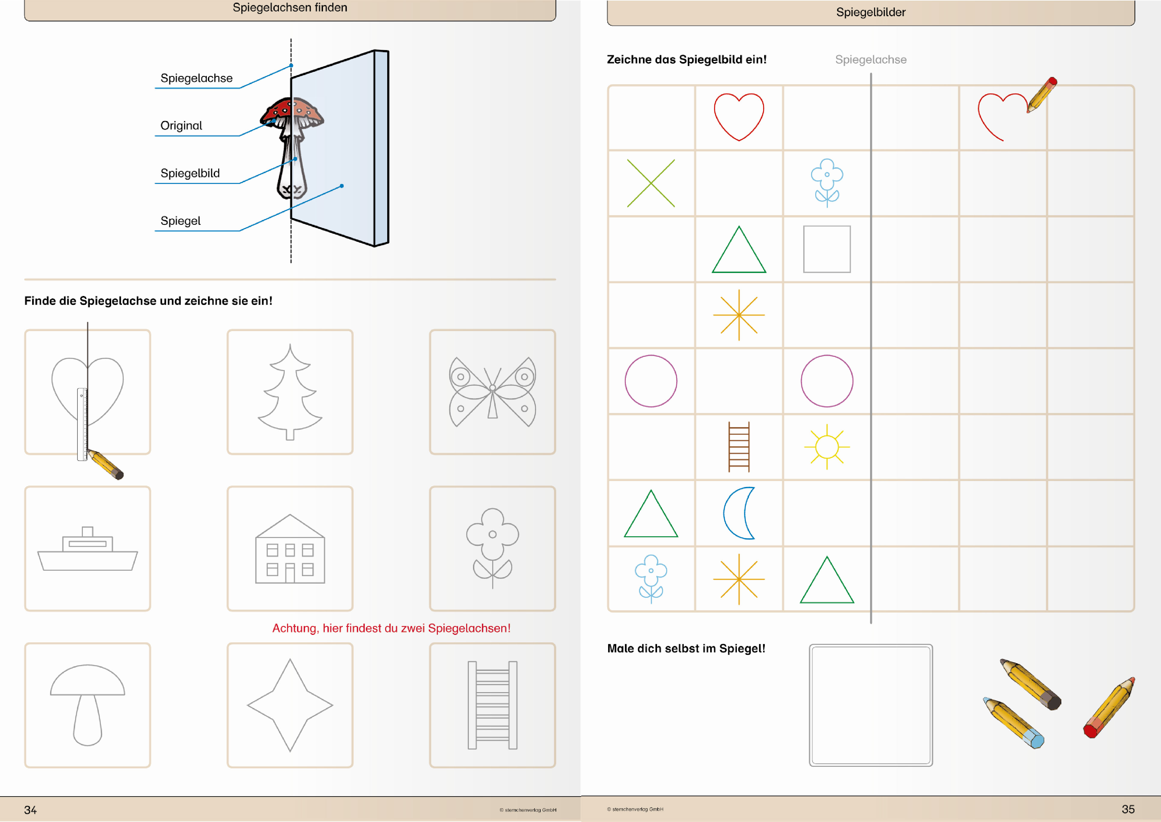 Das Sternchenheft 'Mein Geometrieheft', geeignet für die 1. und 2. Klasse, beinhaltet motivierende Arbeitsseiten zum Thema Form und Raum.Die Aufgaben sind so ausgewählt, dass das Kind möglichst allein und nach eigenem Lerntempo arbeiten kann.Das Kind bekommt schnell eine Raumvorstellung durch aktives Entdecken.Lagebeziehungen und Wege werden erlernt und selbstständig umgesetzt. Einfache geometrische Formen und Körper werden erkannt, benannt und dargestellt. Hierbei zeichnet das Kind frei und mit Hilfsmitteln.Es wird zum genauen Messen motiviert und lernt den richtigen Umgang mit Zeichengeräten wie Bleistift, Lineal und Zirkel.Die Themen entsprechen dem Lehrplan und sind bereits erprobt.